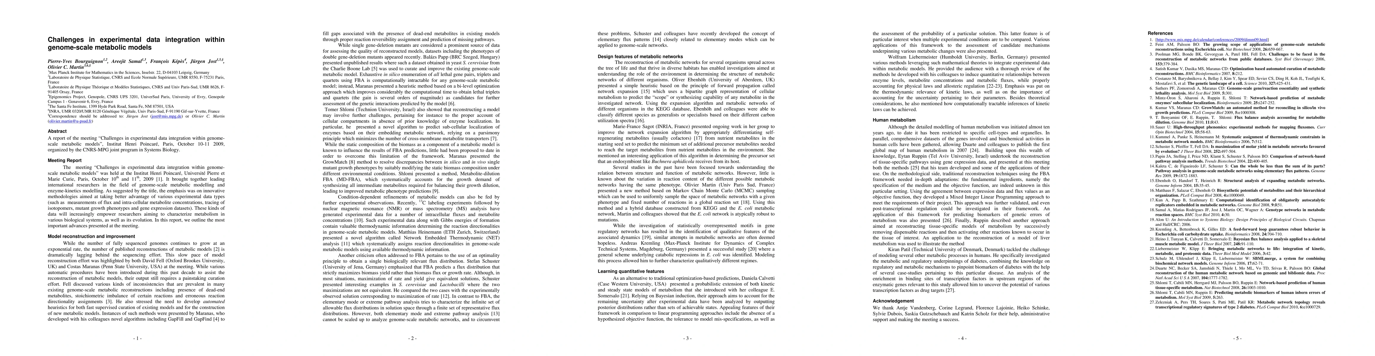 This report summarizes discussions from a meeting on integrating experimental data into genome-scale metabolic models, highlighting challenges and strategies for improving the accuracy and reliability of these models. The meeting was organized by the CNRS-MPG joint program in Systems Biology.
