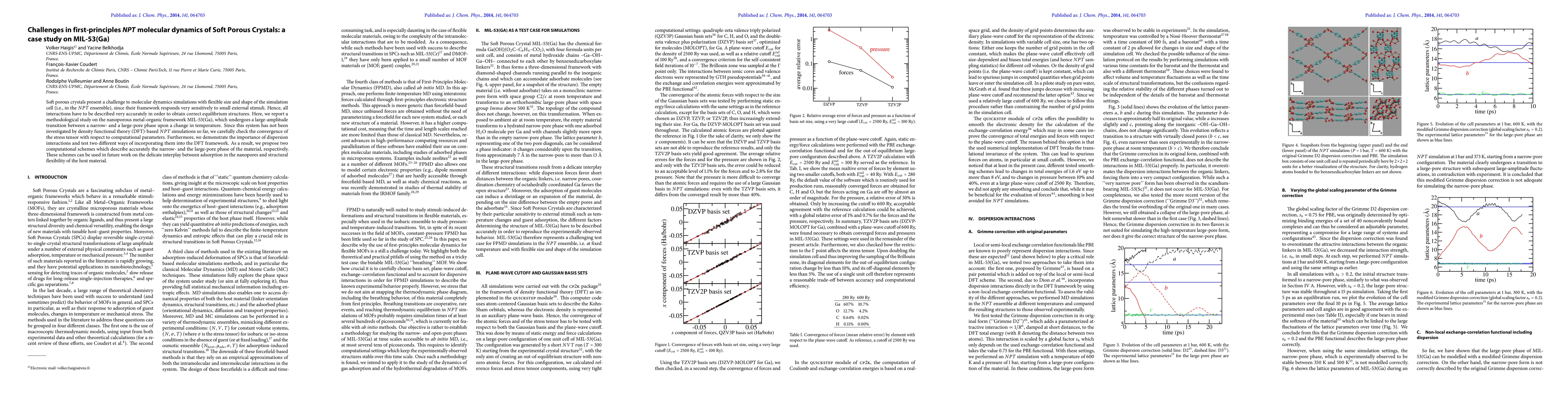 Soft porous crystals present a challenge to molecular dynamics simulations with flexible size and shape of the simulation cell (i.e., in the NPT ensemble), since their framework responds very sensitively to small external stimuli. Hence, all interactions have to be described very accurately in order to obtain correct equilibrium structures. Here, we report a methodological study on the nanoporous metal-organic framework MIL-53(Ga), which undergoes a large-amplitude transition between a narrow- and a large-pore phase upon a change in temperature. Since this system has not been investigated by density functional theory (DFT)-based NPT simulations so far, we carefully check the convergence of the stress tensor with respect to computational parameters. Furthermore, we demonstrate the importance of dispersion interactions and test two different ways of incorporating them into the DFT framework. As a result, we propose two computational schemes which describe accurately the narrow- and the large-pore phase of the material, respectively. These schemes can be used in future work on the delicate interplay between adsorption in the nanopores and structural flexibility of the host material.