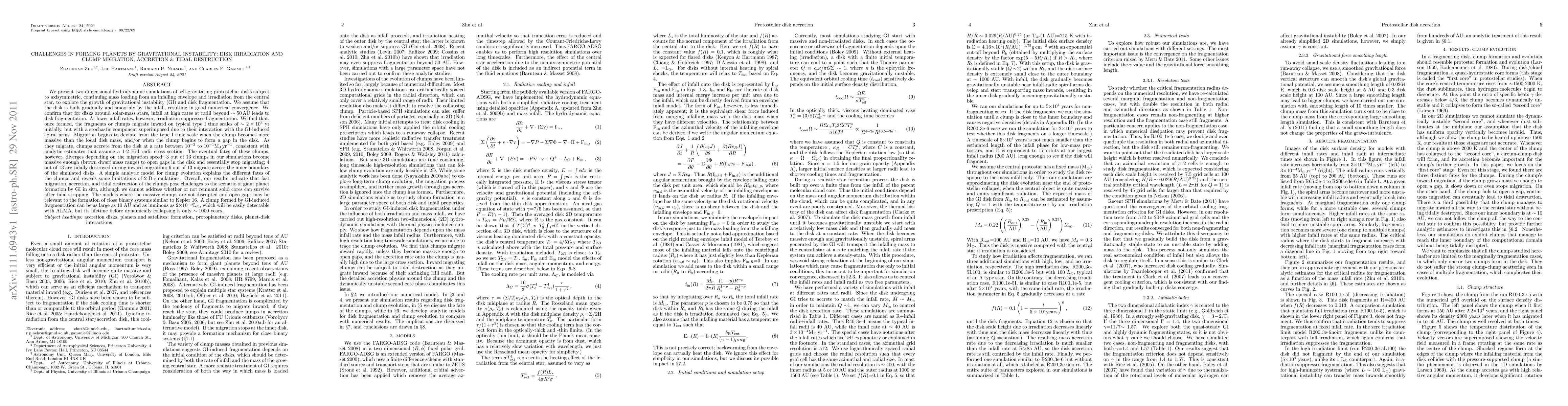 Simulations show that gravitational instability in protostellar disks can lead to disk fragmentation, with fragments migrating inward and either accreting material or being tidally destroyed. This challenges giant planet formation scenarios.