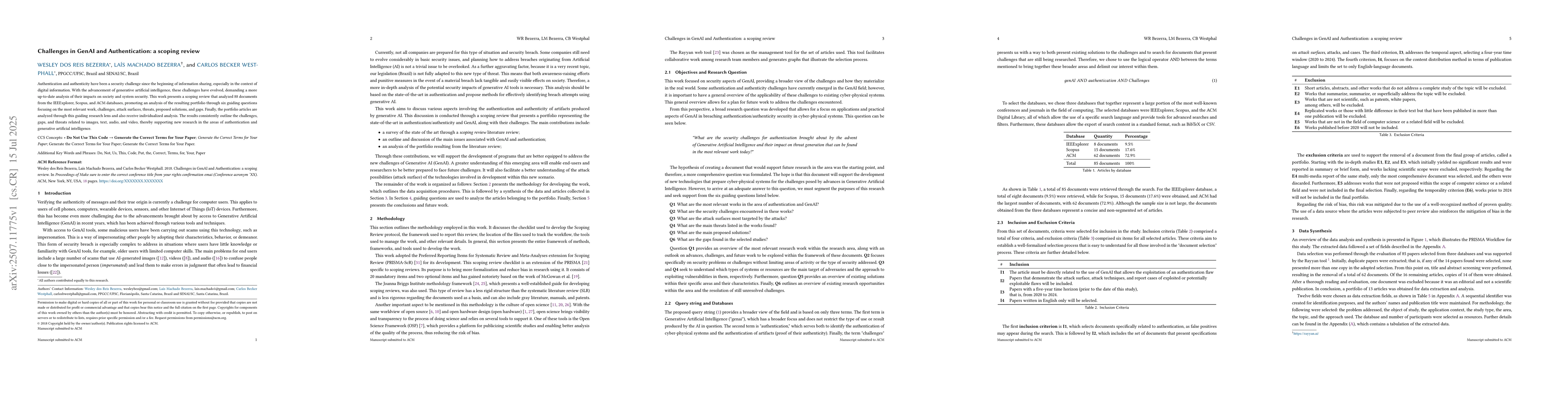 Authentication and authenticity have been a security challenge since the beginning of information sharing, especially in the context of digital information. With the advancement of generative artificial intelligence, these challenges have evolved, demanding a more up-to-date analysis of their impacts on society and system security. This work presents a scoping review that analyzed 88 documents from the IEEExplorer, Scopus, and ACM databases, promoting an analysis of the resulting portfolio through six guiding questions focusing on the most relevant work, challenges, attack surfaces, threats, proposed solutions, and gaps. Finally, the portfolio articles are analyzed through this guiding research lens and also receive individualized analysis. The results consistently outline the challenges, gaps, and threats related to images, text, audio, and video, thereby supporting new research in the areas of authentication and generative artificial intelligence.