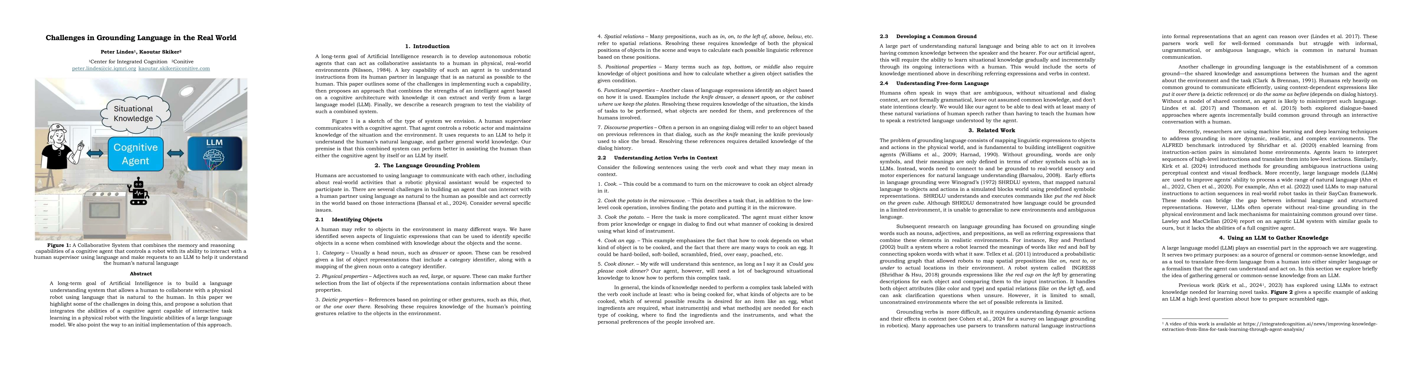 A long-term goal of Artificial Intelligence is to build a language understanding system that allows a human to collaborate with a physical robot using language that is natural to the human. In this paper we highlight some of the challenges in doing this, and propose a solution that integrates the abilities of a cognitive agent capable of interactive task learning in a physical robot with the linguistic abilities of a large language model. We also point the way to an initial implementation of this approach.
