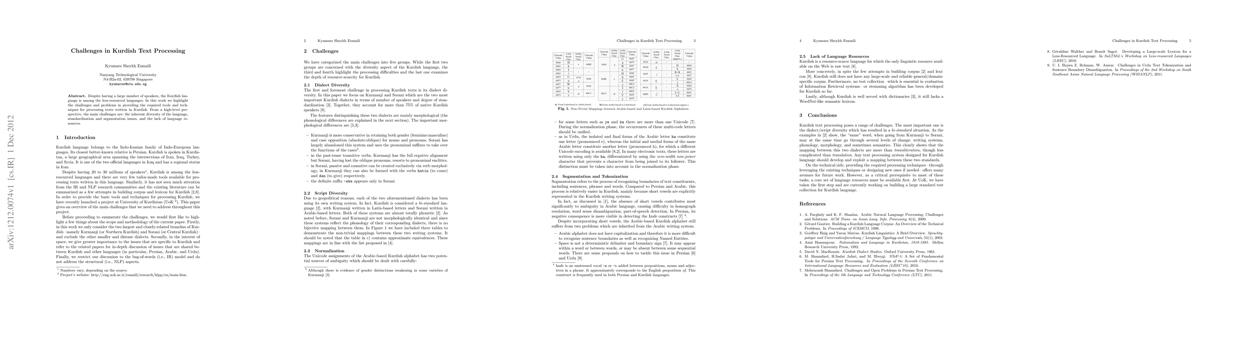 Despite having a large number of speakers, the Kurdish language is among the less-resourced languages. In this work we highlight the challenges and problems in providing the required tools and techniques for processing texts written in Kurdish. From a high-level perspective, the main challenges are: the inherent diversity of the language, standardization and segmentation issues, and the lack of language resources.