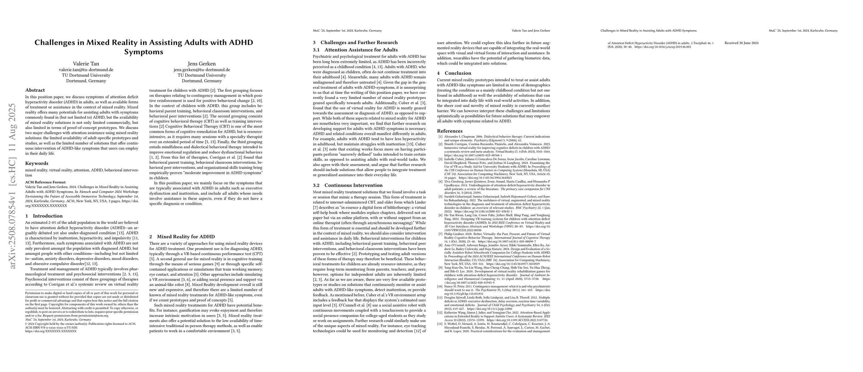 The paper presents a position paper discussing ADHD symptoms in adults and the potential of mixed reality (MR) in assisting them, highlighting the lack of adult-specific MR prototypes and studies, and the need for continuous intervention solutions.