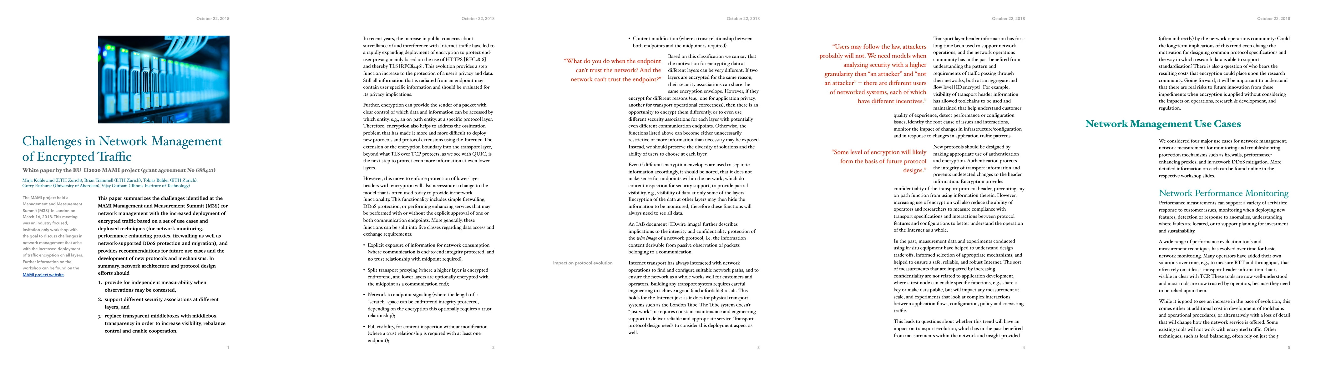 This paper summarizes the challenges identified at the MAMI Management and Measurement Summit (M3S) for network management with the increased deployment of encrypted traffic based on a set of use cases and deployed techniques (for network monitoring, performance enhancing proxies, firewalling as well as network-supported DDoS protection and migration), and provides recommendations for future use cases and the development of new protocols and mechanisms. In summary, network architecture and protocol design efforts should 1) provide for independent measurability when observations may be contested, 2) support different security associations at different layers, and 3) replace transparent middleboxes with middlebox transparency in order to increase visibility, rebalance control and enable cooperation.