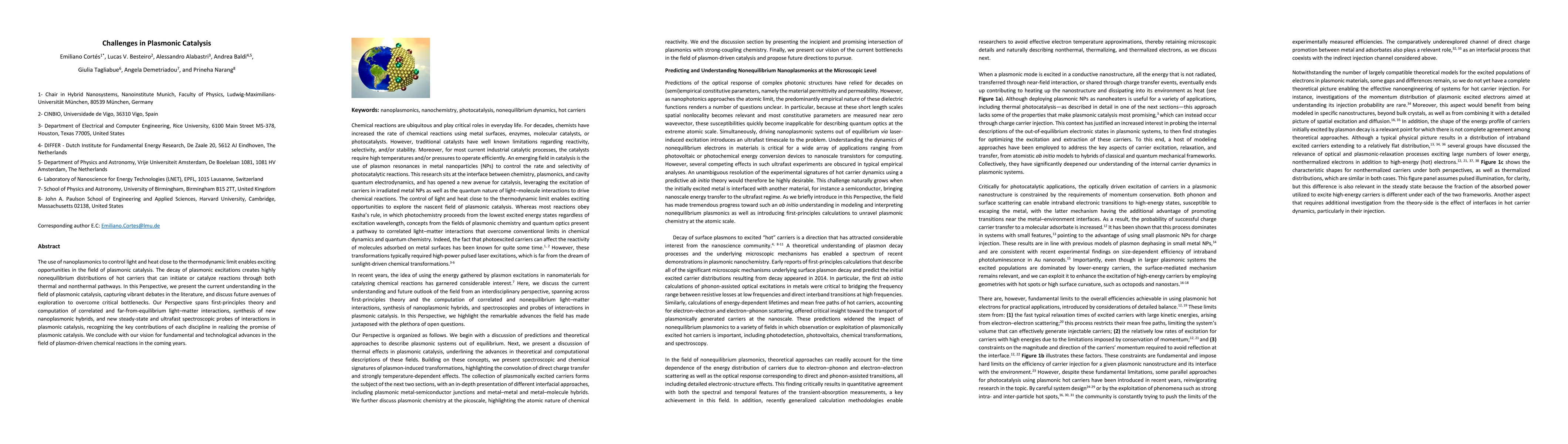 This paper explores the potential and challenges of using nanoplasmonics to control light and heat for catalysis, highlighting debates on nonequilibrium hot carrier interactions and future research directions. It emphasizes the integration of theoretical, computational, and experimental approaches to advance plasmonic catalysis.