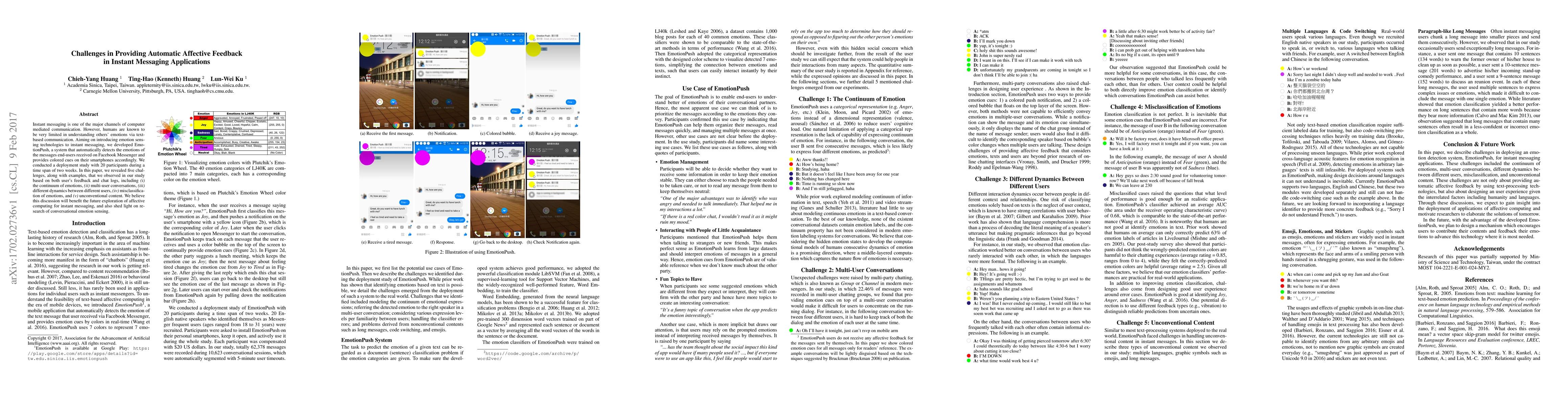 This paper explores challenges in implementing automatic affective feedback in instant messaging, introducing EmotionPush that detects emotions in Facebook Messenger messages. The study identified five main challenges: the continuum of emotions, multi-user conversations, varying user dynamics, misclassification of emotions, and unconventional content, providing insights for future affective computing research.