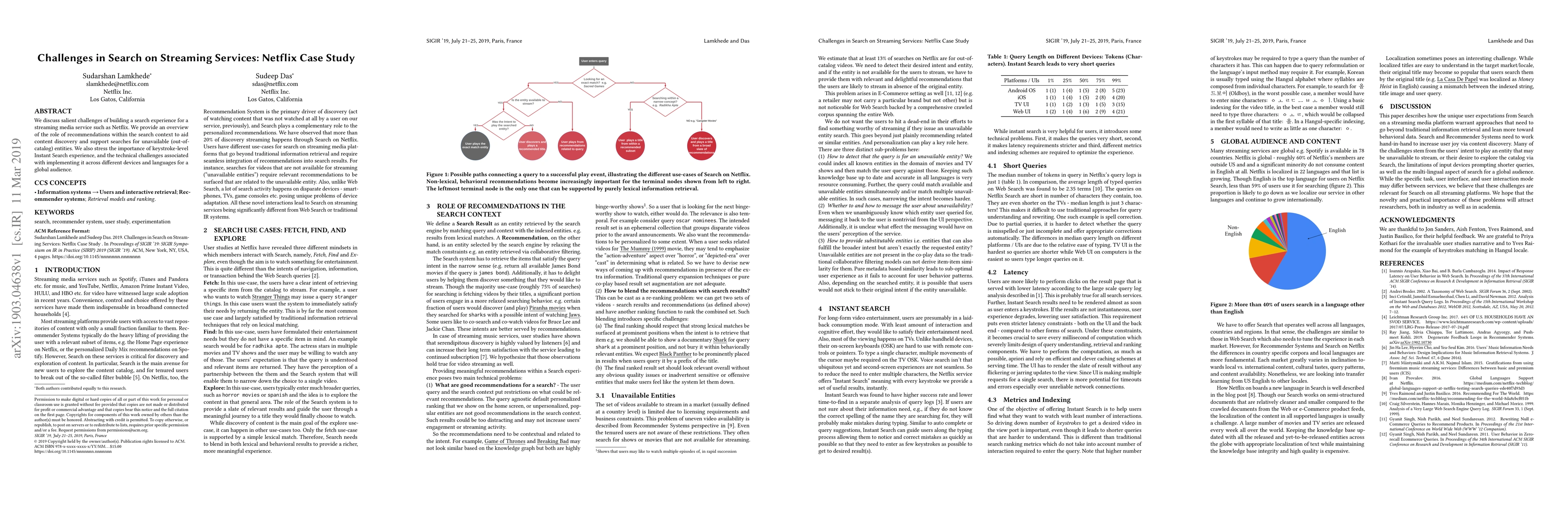 This study examines the difficulties in creating a search function for streaming services like Netflix, emphasizing the integration of recommendations to enhance content discovery and manage searches for unavailable items. It highlights the necessity for instant search experiences and addresses the technical hurdles of deployment across diverse devices and languages worldwide.