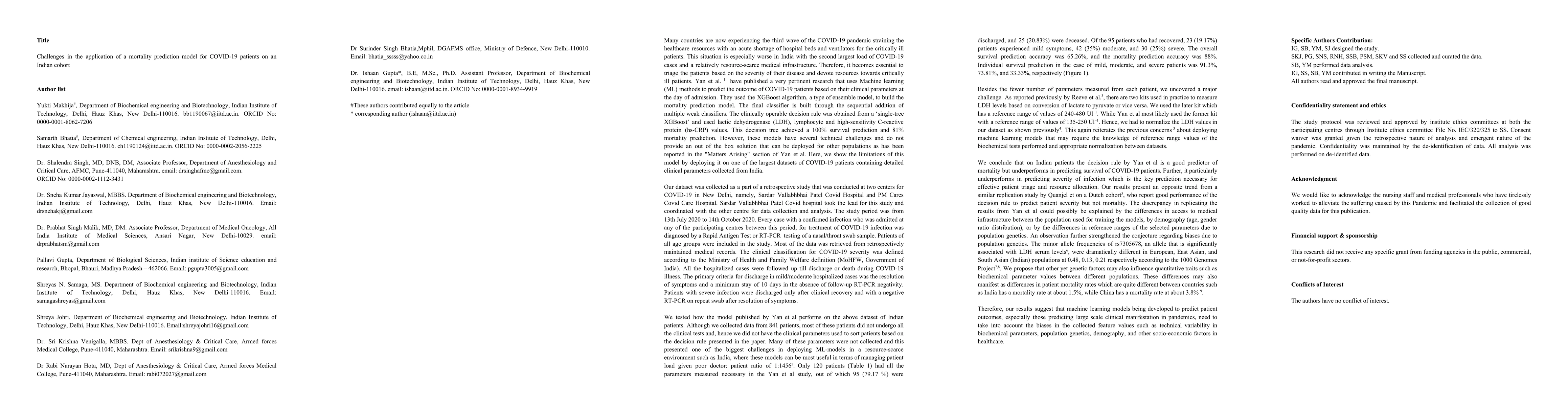 Many countries are now experiencing the third wave of the COVID-19 pandemic straining the healthcare resources with an acute shortage of hospital beds and ventilators for the critically ill patients. This situation is especially worse in India with the second largest load of COVID-19 cases and a relatively resource-scarce medical infrastructure. Therefore, it becomes essential to triage the patients based on the severity of their disease and devote resources towards critically ill patients. Yan et al. 1 have published a very pertinent research that uses Machine learning (ML) methods to predict the outcome of COVID-19 patients based on their clinical parameters at the day of admission. They used the XGBoost algorithm, a type of ensemble model, to build the mortality prediction model. The final classifier is built through the sequential addition of multiple weak classifiers. The clinically operable decision rule was obtained from a 'single-tree XGBoost' and used lactic dehydrogenase (LDH), lymphocyte and high-sensitivity C-reactive protein (hs-CRP) values. This decision tree achieved a 100% survival prediction and 81% mortality prediction. However, these models have several technical challenges and do not provide an out of the box solution that can be deployed for other populations as has been reported in the "Matters Arising" section of Yan et al. Here, we show the limitations of this model by deploying it on one of the largest datasets of COVID-19 patients containing detailed clinical parameters collected from India.