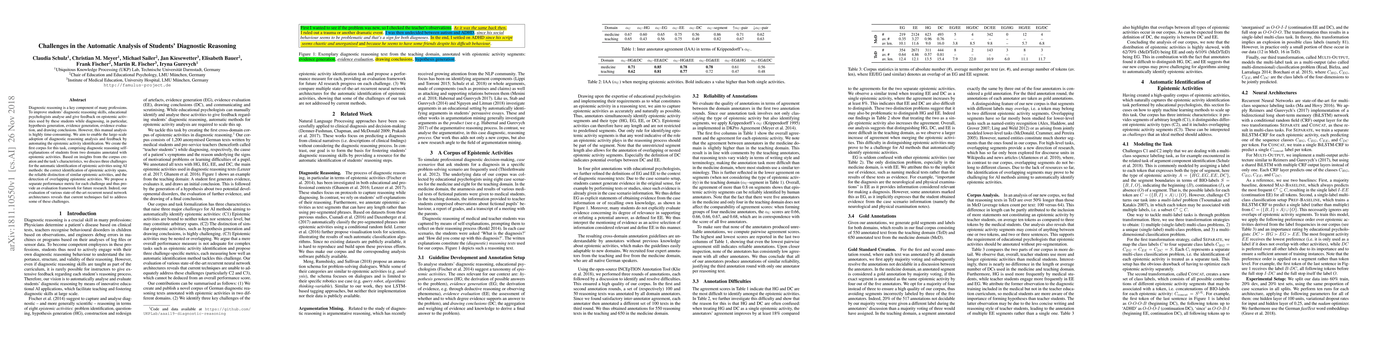 Diagnostic reasoning is a key component of many professions. To improve students' diagnostic reasoning skills, educational psychologists analyse and give feedback on epistemic activities used by these students while diagnosing, in particular, hypothesis generation, evidence generation, evidence evaluation, and drawing conclusions. However, this manual analysis is highly time-consuming. We aim to enable the large-scale adoption of diagnostic reasoning analysis and feedback by automating the epistemic activity identification. We create the first corpus for this task, comprising diagnostic reasoning self-explanations of students from two domains annotated with epistemic activities. Based on insights from the corpus creation and the task's characteristics, we discuss three challenges for the automatic identification of epistemic activities using AI methods: the correct identification of epistemic activity spans, the reliable distinction of similar epistemic activities, and the detection of overlapping epistemic activities. We propose a separate performance metric for each challenge and thus provide an evaluation framework for future research. Indeed, our evaluation of various state-of-the-art recurrent neural network architectures reveals that current techniques fail to address some of these challenges.