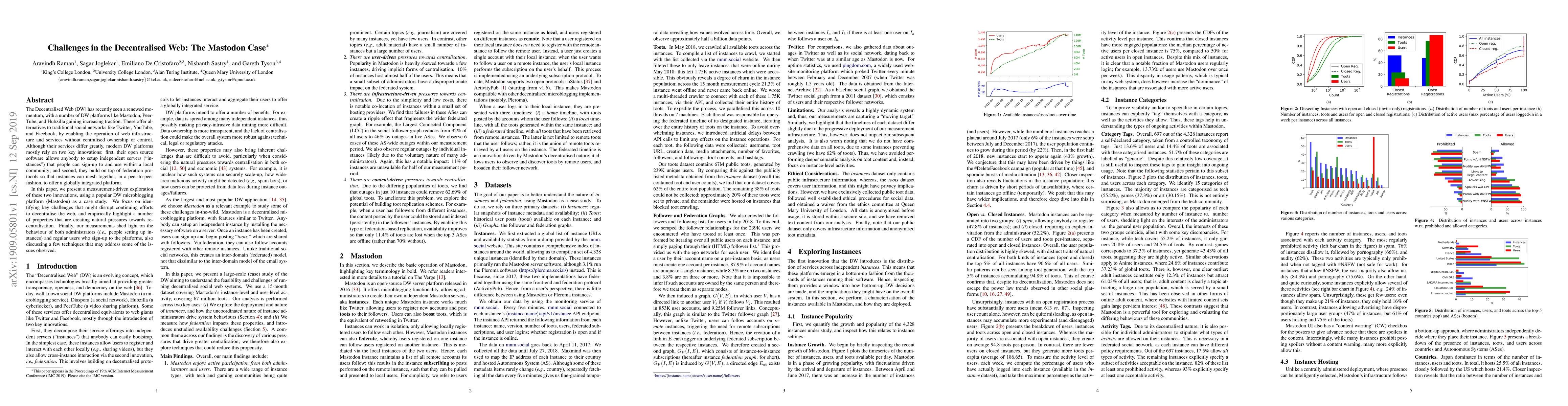 The Decentralised Web (DW) has recently seen a renewed momentum, with a number of DW platforms like Mastodon, Peer-Tube, and Hubzilla gaining increasing traction. These offer alternatives to traditional social networks like Twitter, YouTube, and Facebook, by enabling the operation of web infrastructure and services without centralised ownership or control. Although their services differ greatly, modern DW platforms mostly rely on two key innovations: first, their open source software allows anybody to setup independent servers ("instances") that people can sign-up to and use within a local community; and second, they build on top of federation protocols so that instances can mesh together, in a peer-to-peer fashion, to offer a globally integrated platform. In this paper, we present a measurement-driven exploration of these two innovations, using a popular DW microblogging platform (Mastodon) as a case study. We focus on identifying key challenges that might disrupt continuing efforts to decentralise the web, and empirically highlight a number of properties that are creating natural pressures towards recentralisation. Finally, our measurements shed light on the behaviour of both administrators (i.e., people setting up instances) and regular users who sign-up to the platforms, also discussing a few techniques that may address some of the issues observed.