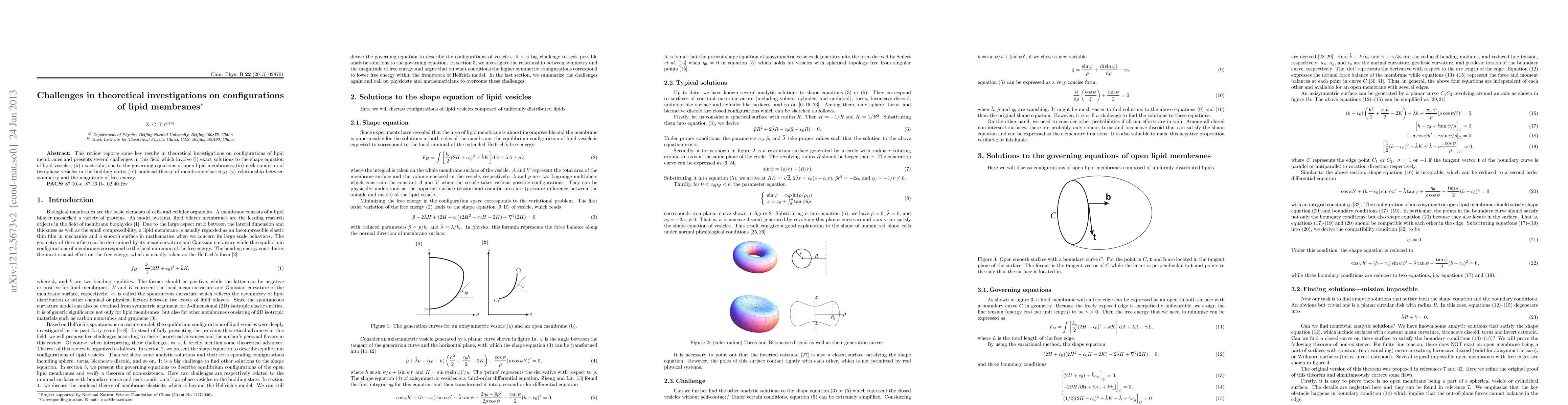 This review highlights key theoretical findings on lipid membrane configurations and identifies challenges including exact solutions for vesicle shapes, open membrane equations, neck conditions in budding vesicles, nonlocal elasticity theories, and the link between symmetry and free energy.