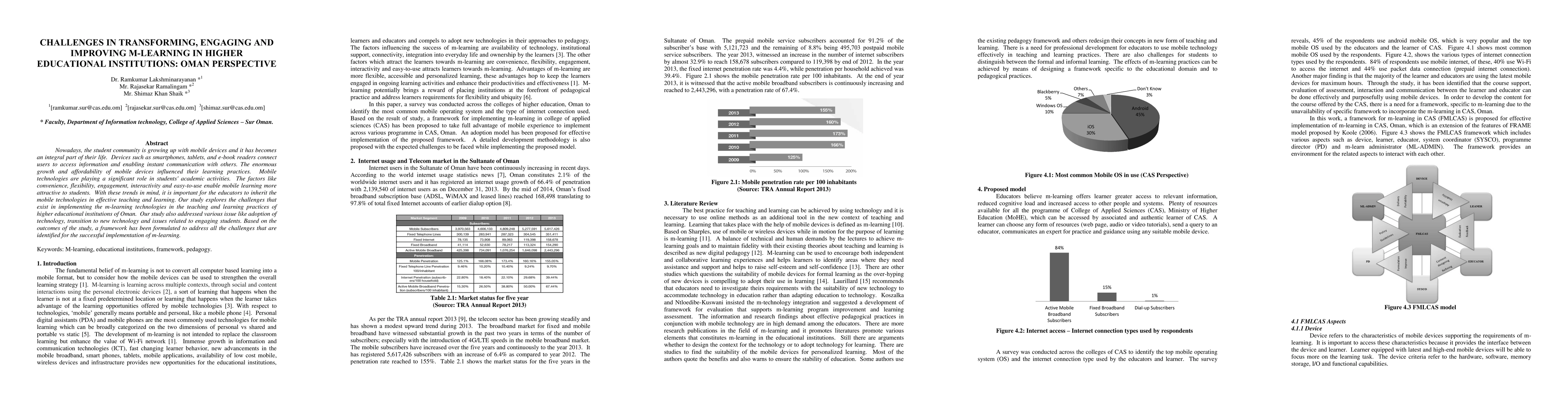 This study explores the challenges in implementing mobile learning (m-learning) in Oman's higher educational institutions, focusing on technology adoption, student engagement, and transition issues. A framework is proposed to address these challenges for successful m-learning integration.