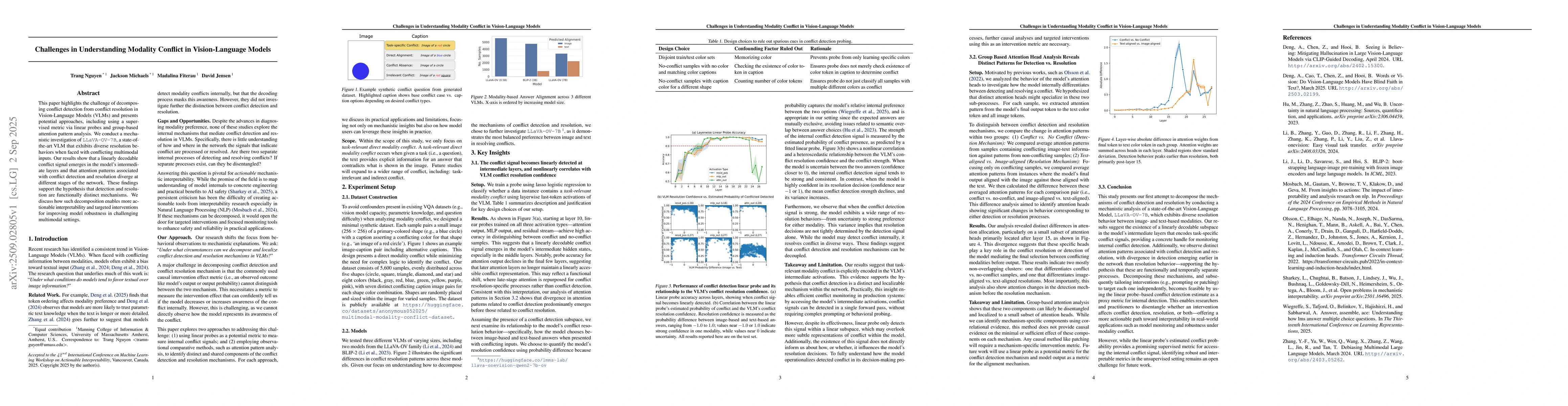 This paper highlights the challenge of decomposing conflict detection from conflict resolution in Vision-Language Models (VLMs) and presents potential approaches, including using a supervised metric via linear probes and group-based attention pattern analysis. We conduct a mechanistic investigation of LLaVA-OV-7B, a state-of-the-art VLM that exhibits diverse resolution behaviors when faced with conflicting multimodal inputs. Our results show that a linearly decodable conflict signal emerges in the model's intermediate layers and that attention patterns associated with conflict detection and resolution diverge at different stages of the network. These findings support the hypothesis that detection and resolution are functionally distinct mechanisms. We discuss how such decomposition enables more actionable interpretability and targeted interventions for improving model robustness in challenging multimodal settings.