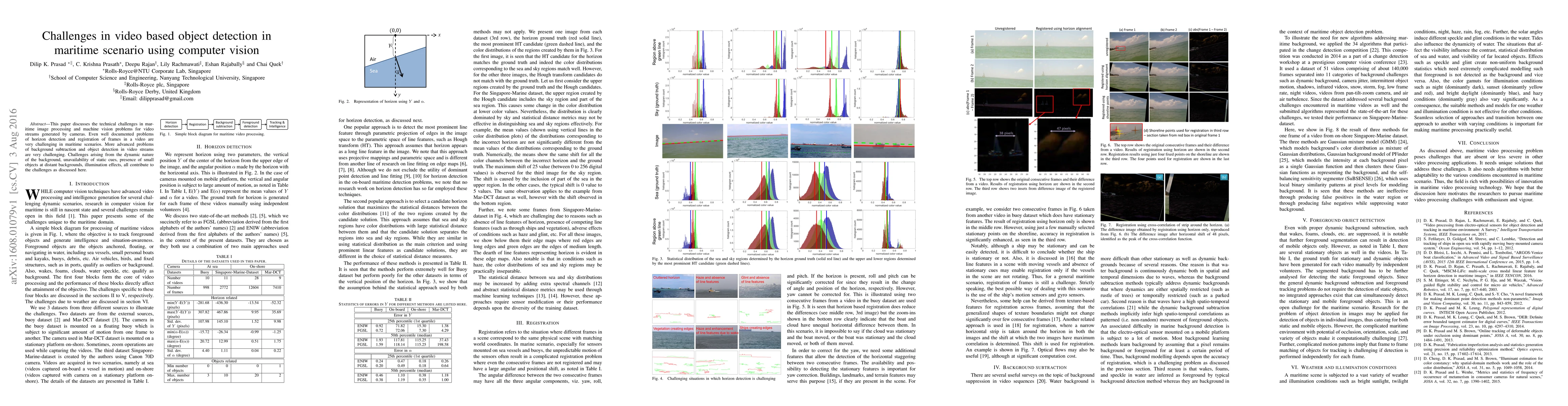 This paper explores the technical difficulties in maritime video-based object detection using computer vision, highlighting the challenges of horizon detection, frame registration, background subtraction, and object detection amidst dynamic backgrounds and varying illumination conditions.