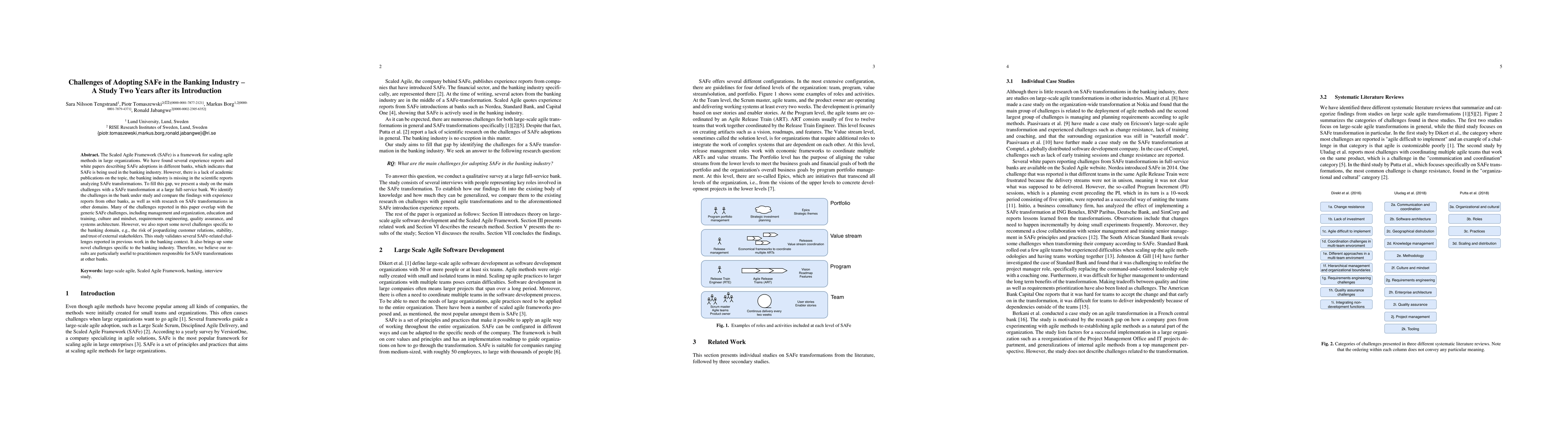 A study on SAFe adoption in a large bank reveals common challenges such as management, education, and culture issues, as well as novel challenges specific to the banking industry, including risk to customer relations and trust.