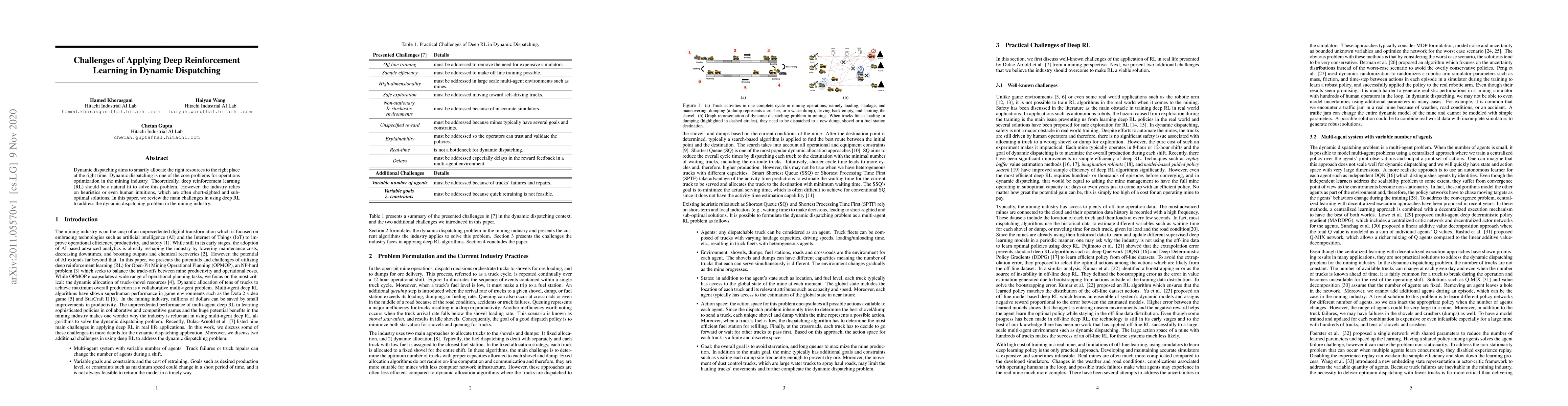 Dynamic dispatching aims to smartly allocate the right resources to the right place at the right time. Dynamic dispatching is one of the core problems for operations optimization in the mining industry. Theoretically, deep reinforcement learning (RL) should be a natural fit to solve this problem. However, the industry relies on heuristics or even human intuitions, which are often short-sighted and sub-optimal solutions. In this paper, we review the main challenges in using deep RL to address the dynamic dispatching problem in the mining industry.