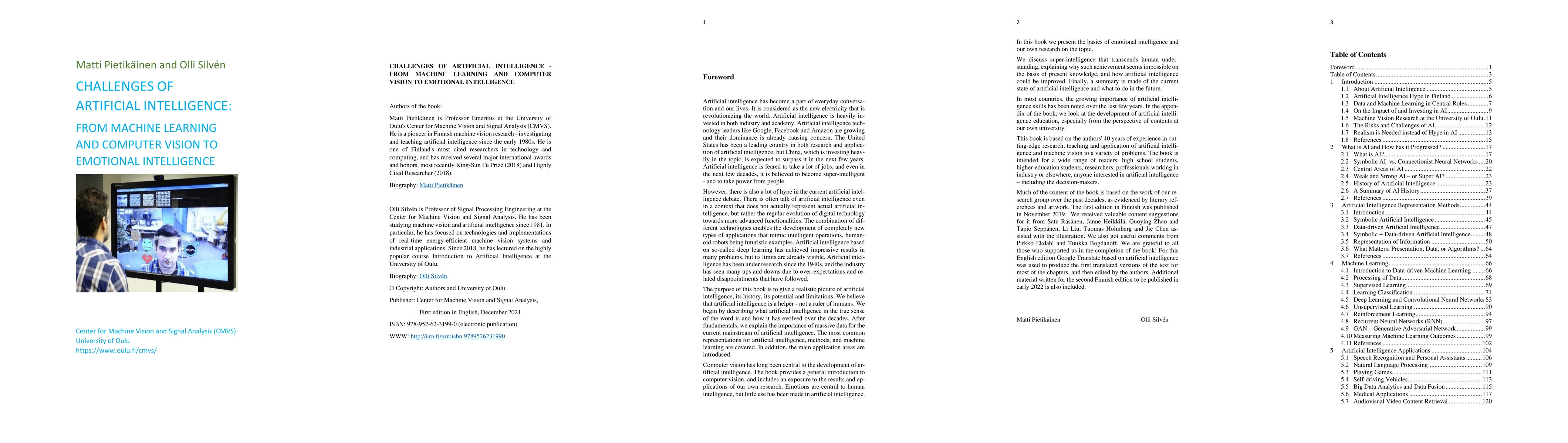 Artificial intelligence (AI) has become a part of everyday conversation and our lives. It is considered as the new electricity that is revolutionizing the world. AI is heavily invested in both industry and academy. However, there is also a lot of hype in the current AI debate. AI based on so-called deep learning has achieved impressive results in many problems, but its limits are already visible. AI has been under research since the 1940s, and the industry has seen many ups and downs due to over-expectations and related disappointments that have followed. The purpose of this book is to give a realistic picture of AI, its history, its potential and limitations. We believe that AI is a helper, not a ruler of humans. We begin by describing what AI is and how it has evolved over the decades. After fundamentals, we explain the importance of massive data for the current mainstream of artificial intelligence. The most common representations for AI, methods, and machine learning are covered. In addition, the main application areas are introduced. Computer vision has been central to the development of AI. The book provides a general introduction to computer vision, and includes an exposure to the results and applications of our own research. Emotions are central to human intelligence, but little use has been made in AI. We present the basics of emotional intelligence and our own research on the topic. We discuss super-intelligence that transcends human understanding, explaining why such achievement seems impossible on the basis of present knowledge,and how AI could be improved. Finally, a summary is made of the current state of AI and what to do in the future. In the appendix, we look at the development of AI education, especially from the perspective of contents at our own university.