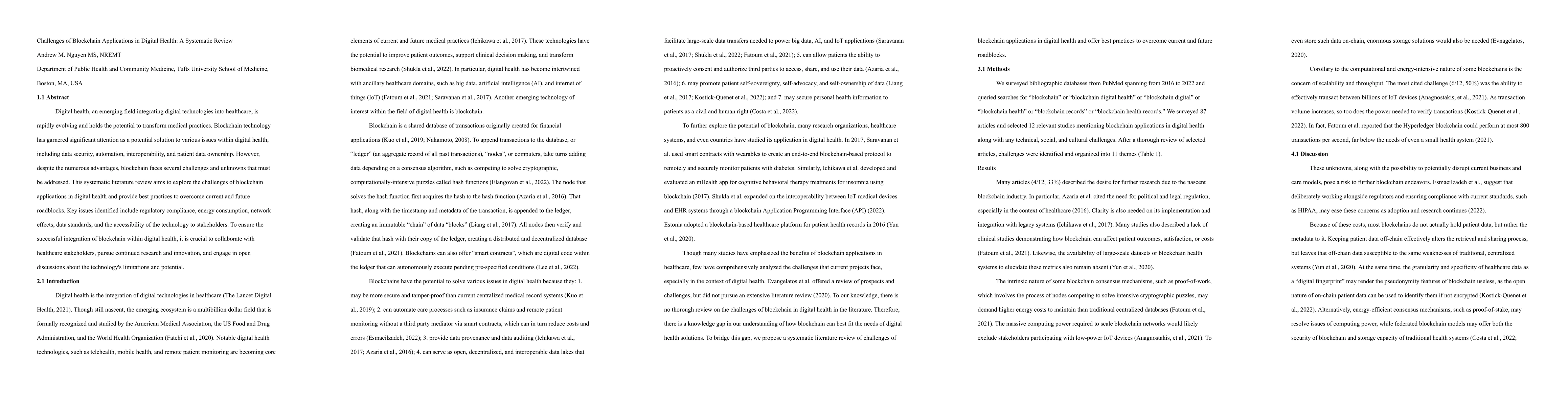 This systematic review investigates the challenges of blockchain in digital health, highlighting issues like regulatory compliance, energy consumption, and data standards. It emphasizes the need for collaborative efforts and ongoing research to address these obstacles for successful integration.