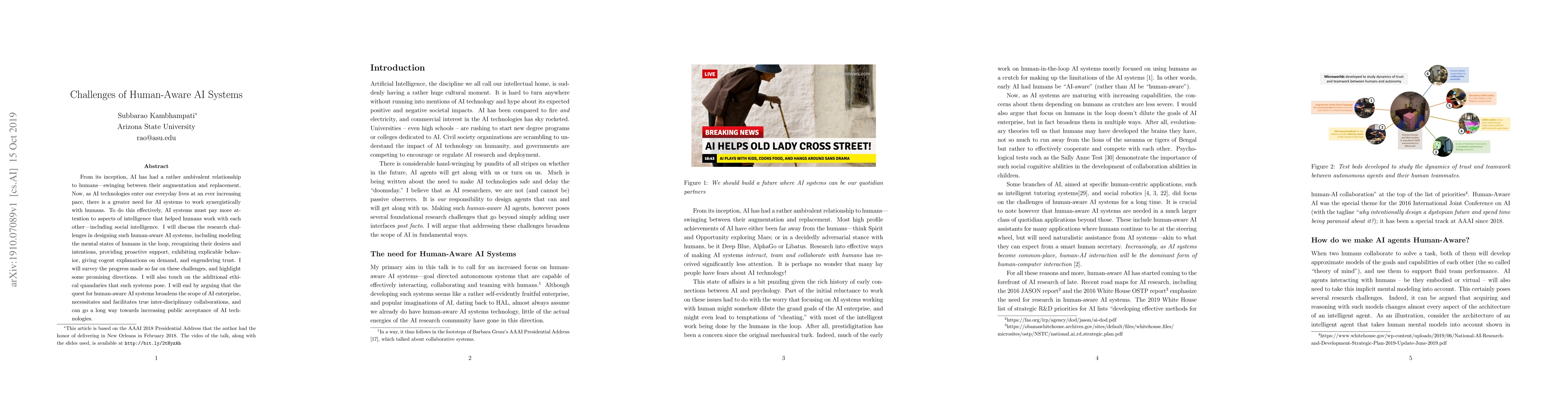 From its inception, AI has had a rather ambivalent relationship to humans---swinging between their augmentation and replacement. Now, as AI technologies enter our everyday lives at an ever increasing pace, there is a greater need for AI systems to work synergistically with humans. To do this effectively, AI systems must pay more attention to aspects of intelligence that helped humans work with each other---including social intelligence. I will discuss the research challenges in designing such human-aware AI systems, including modeling the mental states of humans in the loop, recognizing their desires and intentions, providing proactive support, exhibiting explicable behavior, giving cogent explanations on demand, and engendering trust. I will survey the progress made so far on these challenges, and highlight some promising directions. I will also touch on the additional ethical quandaries that such systems pose. I will end by arguing that the quest for human-aware AI systems broadens the scope of AI enterprise, necessitates and facilitates true inter-disciplinary collaborations, and can go a long way towards increasing public acceptance of AI technologies.