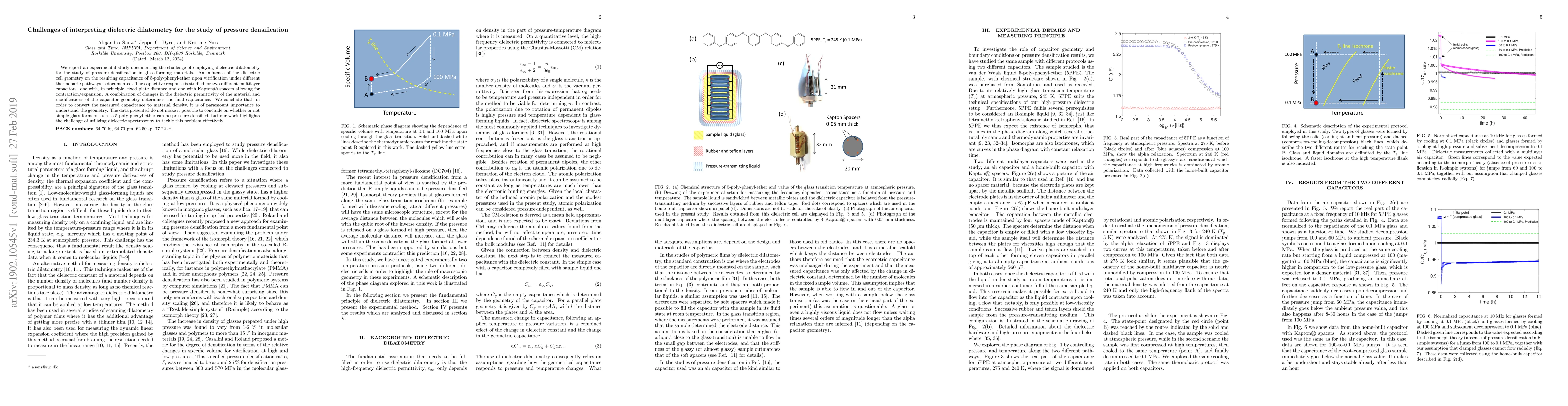 We report an experimental study documenting the challenge of employing dielectric dilatometry for the study of pressure densification in glass-forming materials. An influence of the dielectric cell geometry on the resulting capacitance of 5-poly-phenyl-ether upon vitrification under different thermobaric pathways is documented. The capacitive response is studied for two different multilayer capacitors: one with, in principle, fixed plate distance and one with Kapton spacers allowing for contraction/expansion. A combination of changes in the dielectric permittivity of the material and modifications of the capacitor geometry determines the final capacitance. We conclude that, in order to convert the measured capacitance to material density, it is of paramount importance to understand the geometry. The data presented do not make it possible to conclude on whether or not simple glass formers such as 5-poly-phenyl-ether can be pressure densified, but our work highlights the challenge of utilizing dielectric spectroscopy to tackle this problem effectively.