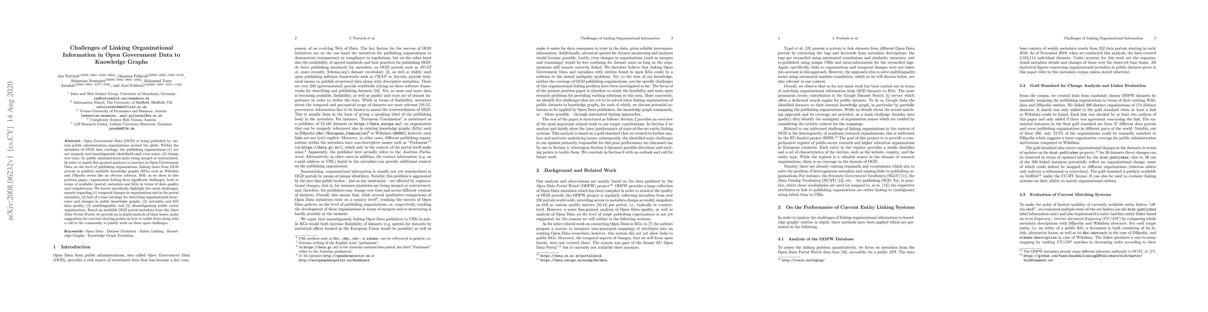 This paper discusses the challenges of linking Open Government Data (OGD) to knowledge graphs due to issues like temporal changes in organizations, lack of a base ontology, data quality, multilinguality, and disambiguating public sector entities. It calls for community collaboration to address these open challenges.