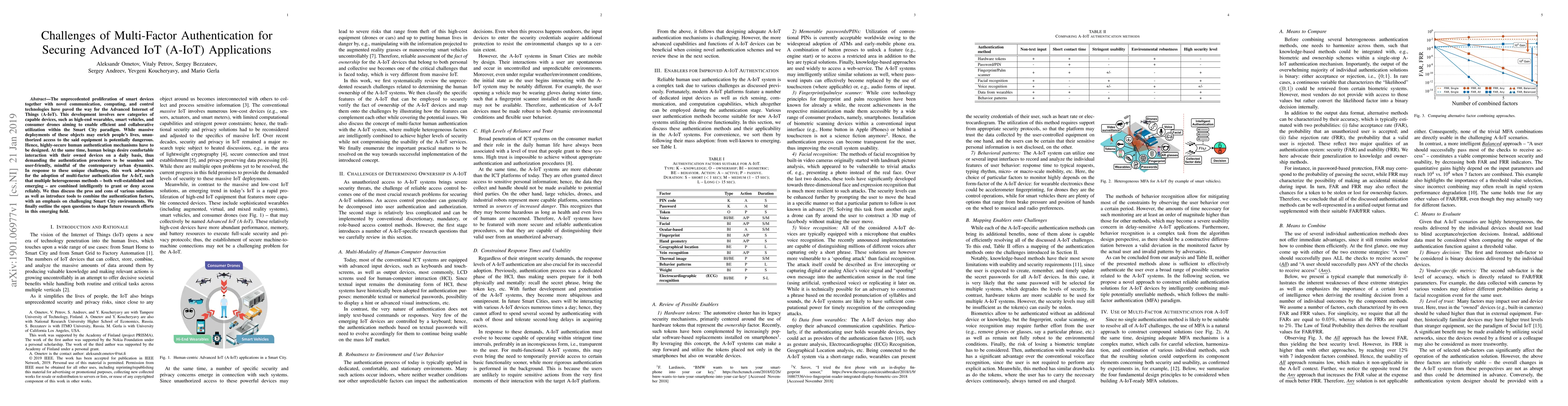 The unprecedented proliferation of smart devices together with novel communication, computing, and control technologies have paved the way for the Advanced Internet of Things~(A-IoT). This development involves new categories of capable devices, such as high-end wearables, smart vehicles, and consumer drones aiming to enable efficient and collaborative utilization within the Smart City paradigm. While massive deployments of these objects may enrich people's lives, unauthorized access to the said equipment is potentially dangerous. Hence, highly-secure human authentication mechanisms have to be designed. At the same time, human beings desire comfortable interaction with their owned devices on a daily basis, thus demanding the authentication procedures to be seamless and user-friendly, mindful of the contemporary urban dynamics. In response to these unique challenges, this work advocates for the adoption of multi-factor authentication for A-IoT, such that multiple heterogeneous methods - both well-established and emerging - are combined intelligently to grant or deny access reliably. We thus discuss the pros and cons of various solutions as well as introduce tools to combine the authentication factors, with an emphasis on challenging Smart City environments. We finally outline the open questions to shape future research efforts in this emerging field.