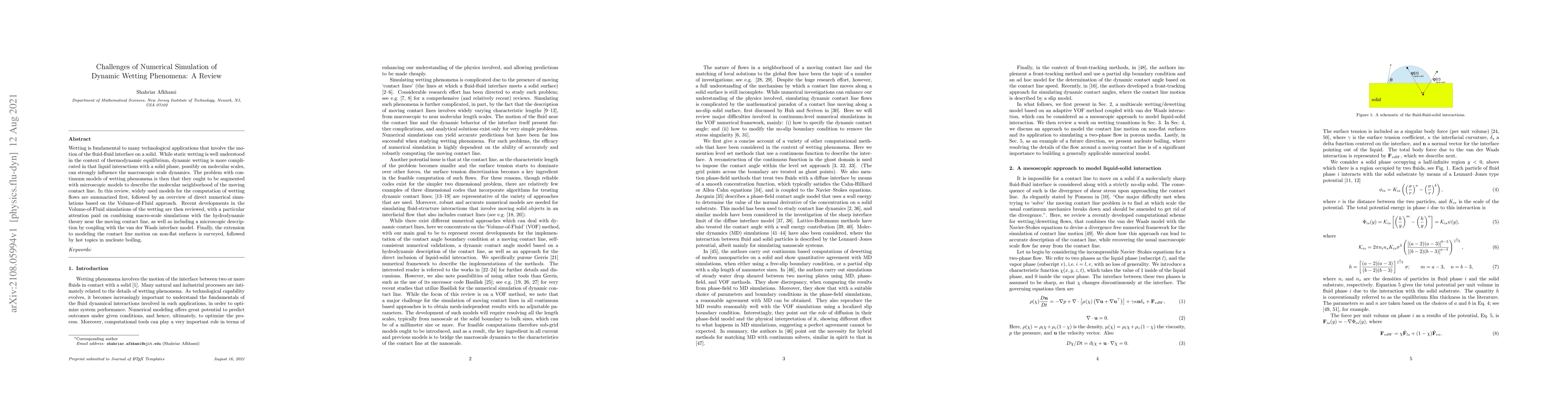 This review examines the complexities of numerical simulation in dynamic wetting phenomena, highlighting the challenges of integrating continuum and microscopic models to accurately capture the behavior of fluid-solid interfaces. It also discusses recent advancements in Volume-of-Fluid simulations and their application to non-flat surfaces and nucleate boiling.