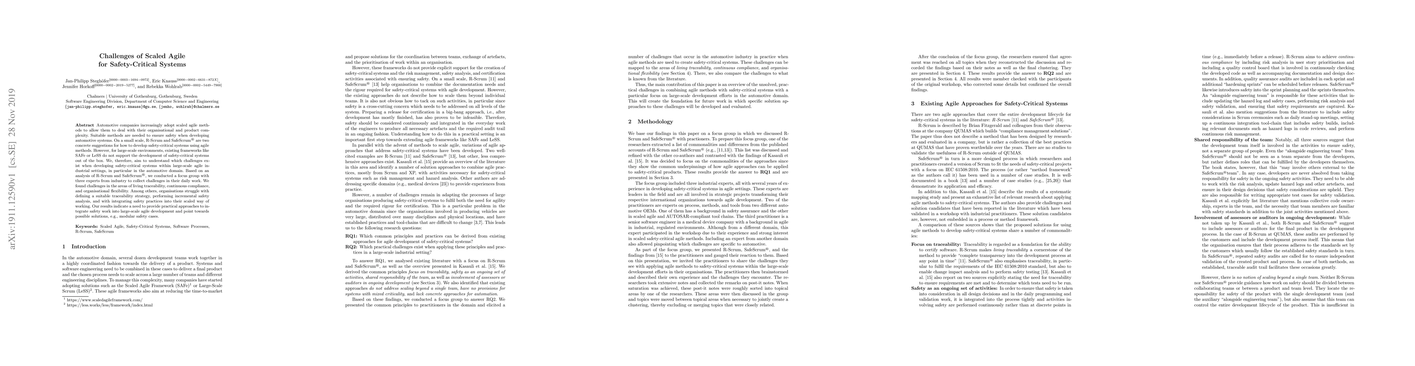 This paper investigates the challenges of implementing scaled agile methods in the development of safety-critical systems, particularly in the automotive industry. Key challenges identified include living traceability, continuous compliance, and organizational flexibility, highlighting the need for practical approaches to integrate safety practices into large-scale agile frameworks.
