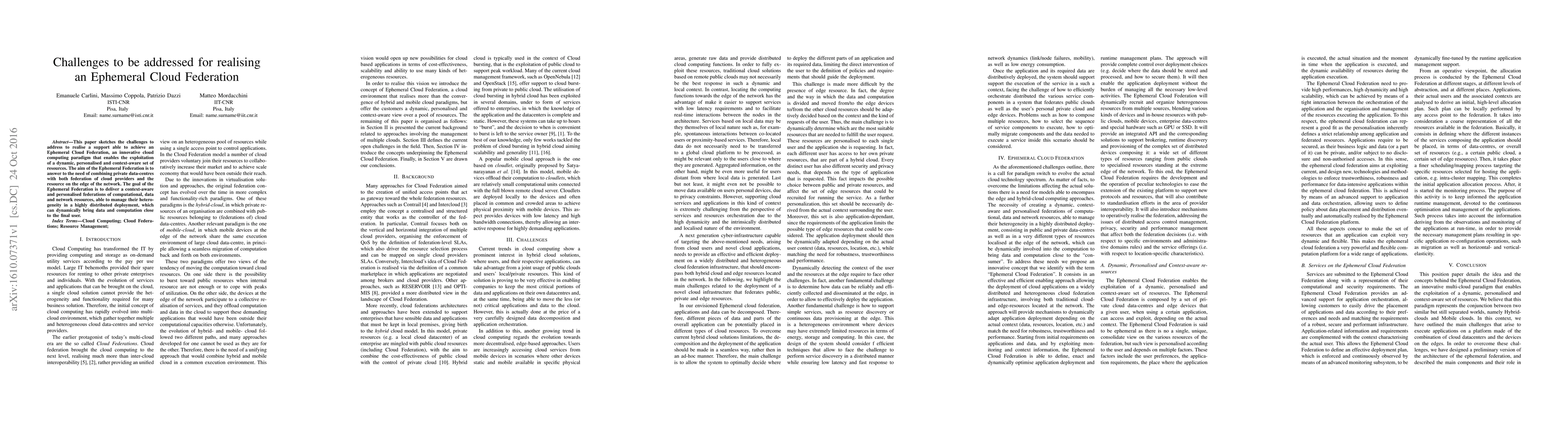 This paper sketches the challenges to address to realise a support able to achieve an Ephemeral Cloud Federation, an innovative cloud computing paradigm that enables the exploitation of a dynamic, personalised and context-aware set of resources. The aim of the Ephemeral Federation is to answer to the need of combining private data-centres with both federation of cloud providers and the resource on the edge of the network. The goal of the Ephemeral Federation is to deliver a context-aware and personalised federations of computational, data and network resources, able to manage their heterogeneity in a highly distributed deployment, which can dynamically bring data and computation close to the final user.