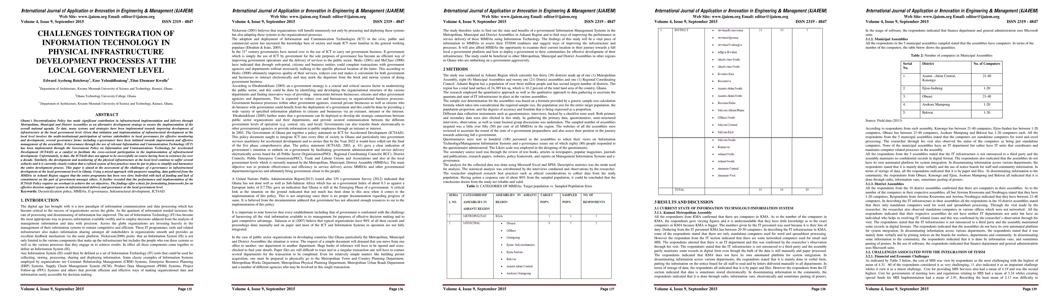 Ghana's Decentralization Policy has made significant contribution in infrastructural implementation and delivery through Metropolitan, Municipal and District Assemblies as an alternative development strategy to ensure the implementation of the overall national agenda. To date, many systems and strategies have been implemented towards improving development of infrastructure at the local government level. Given that initiation and implementation of infrastructural development at the local level involves the multi-institutional participation of various stakeholders in local governance for effective monitoring and development, several governance forms including e-governance have been initiated towards improvement and effective management of the assemblies. E-Governance through the use of relevant Information and Communication Technology has been implemented through the Government Policy on Information and Communications Technology for Accelerated Development as a catalyst to facilitate the cross-sectoral participation in the implementation of infrastructural development. Unfortunately, to date, the ICT4AD does not appear to be successfully on course having been in existence for over a decade. Similarly, the development and monitoring of the physical infrastructure at the local level continue to suffer several setbacks and it is currently clearly evident that a refined system of best practices must be put in place to simplify and harmonize the entire development process. This paper is aimed at the assessment of the challenges of e-governance in infrastructural development at the local government level in Ghana. Using a mixed approach with purposive sampling, data gathered from the MMDAs in Ashanti Region suggest that the entire programme has been very slow; bedeviled with lack of funding and
