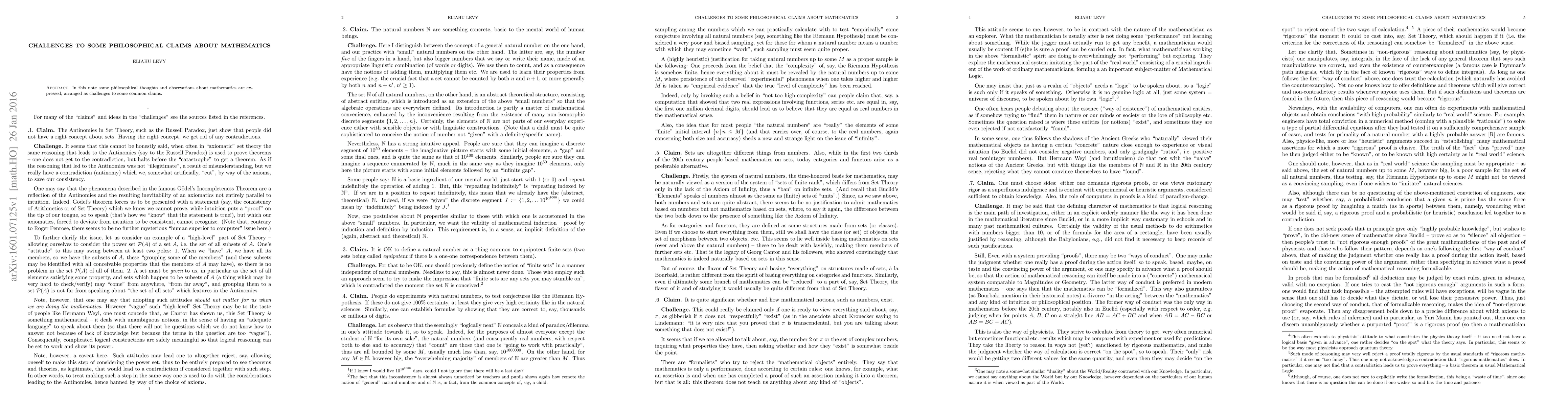 In this note some philosophical thoughts and observations about mathematics are expressed, arranged as challenges to some common claims.