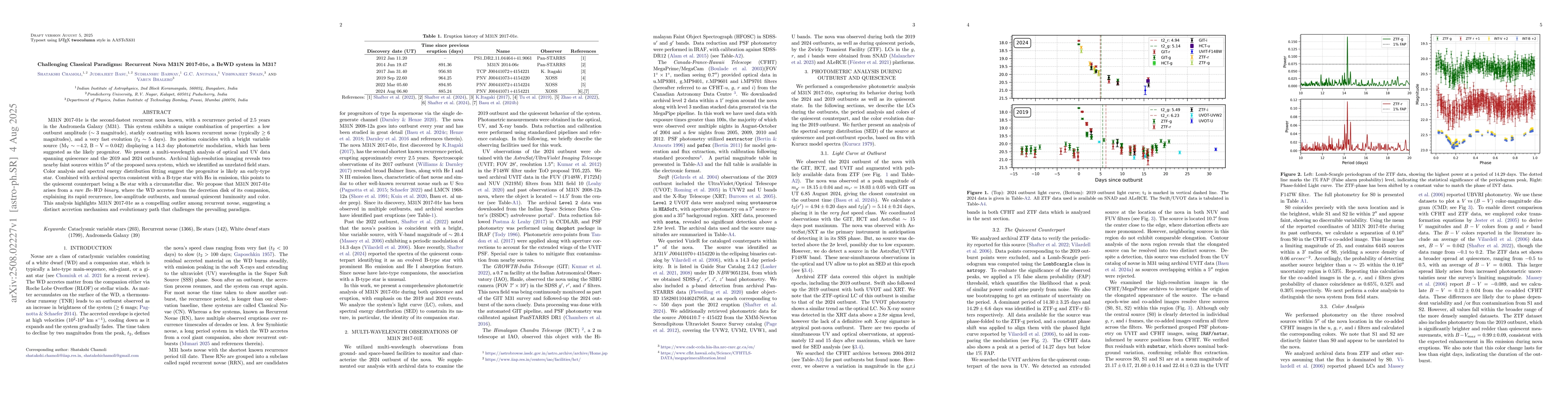 M31N 2017-01e is the second-fastest recurrent nova known, with a recurrence period of 2.5 years in the Andromeda Galaxy (M31). This system exhibits a unique combination of properties: a low outburst amplitude ($\sim3$ magnitude), starkly contrasting with known recurrent novae (typically $\geq 6$ magnitudes), and a very fast evolution ($t_{2}\sim 5 $ days). Its position coincides with a bright variable source ($\mathrm{{M_V \sim -4.2,\, B-V= 0.042}}$) displaying a 14.3 day photometric modulation, which has been suggested as the likely progenitor. We present a multi-wavelength analysis of optical and UV data spanning quiescence and the 2019 and 2024 outbursts. Archival high-resolution imaging reveals two nearby faint sources within $5^{\prime\prime}$ of the proposed nova system, which we identified as unrelated field stars. Color analysis and spectral energy distribution fitting suggest the progenitor is likely an early-type star. Combined with archival spectra consistent with a B-type star with H$\alpha$ in emission, this points to the quiescent counterpart being a Be star with a circumstellar disc. We propose that M31N 2017-01e arises from a rare Be-WD binary, where the WD accretes from the decretion disk of its companion, explaining its rapid recurrence, low-amplitude outbursts, and unusual quiescent luminosity and color. This analysis highlights M31N 2017-01e as a compelling outlier among recurrent novae, suggesting a distinct accretion mechanism and evolutionary path that challenges the prevailing paradigm.