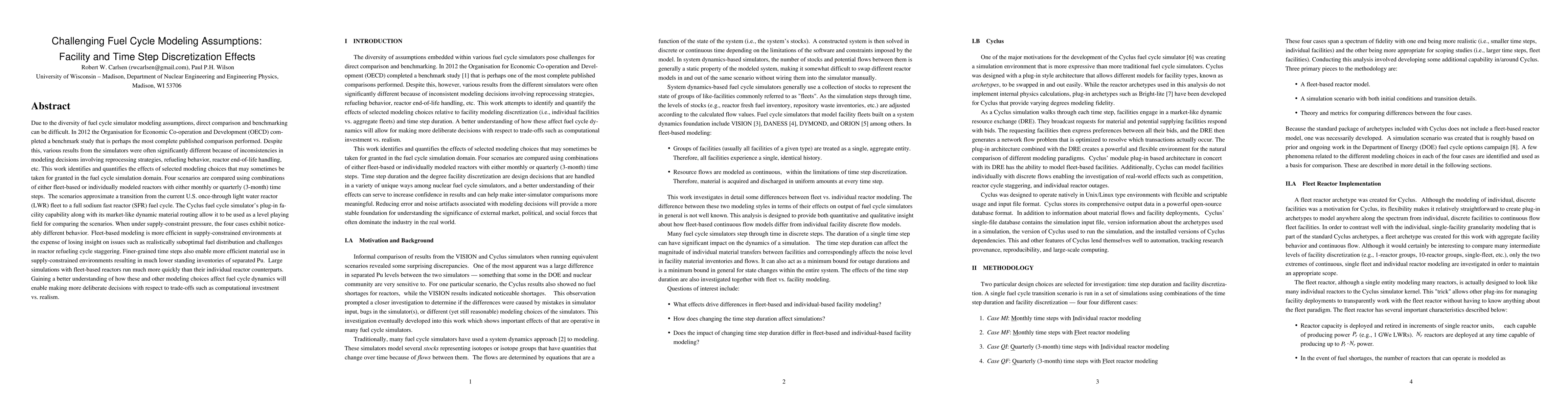 This paper examines the impact of modeling assumptions in fuel cycle simulations, specifically focusing on reactor modeling (fleet-based vs. individual) and time step discretization (monthly vs. quarterly). It finds that fleet-based modeling is more efficient under supply-constrained conditions but lacks detail on fuel distribution and reactor refueling, while finer time steps improve material efficiency and reduce Pu inventories.