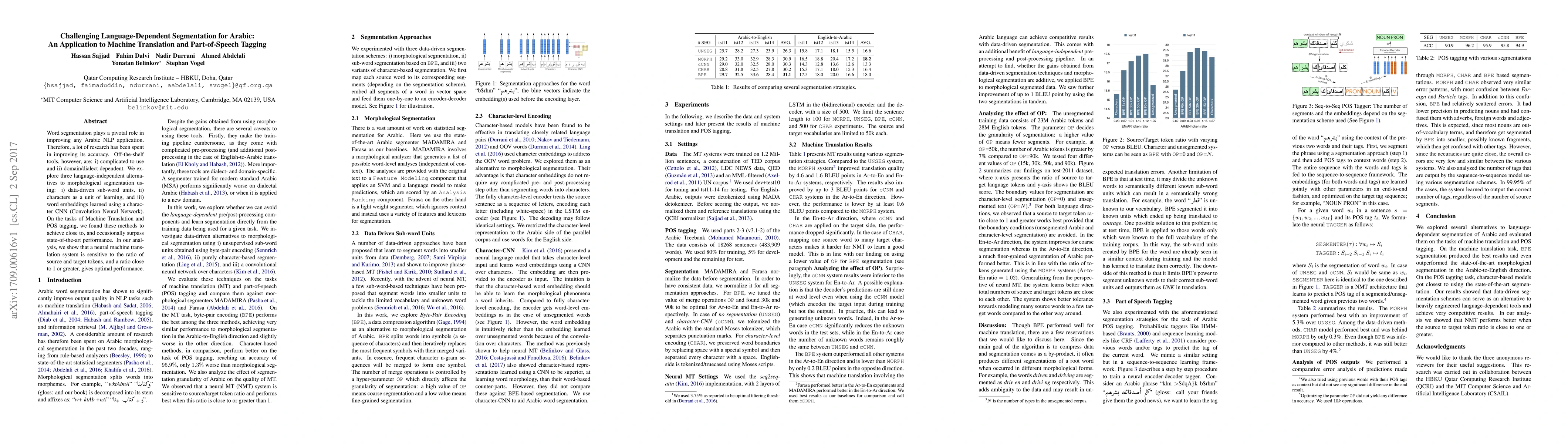 Word segmentation plays a pivotal role in improving any Arabic NLP application. Therefore, a lot of research has been spent in improving its accuracy. Off-the-shelf tools, however, are: i) complicated to use and ii) domain/dialect dependent. We explore three language-independent alternatives to morphological segmentation using: i) data-driven sub-word units, ii) characters as a unit of learning, and iii) word embeddings learned using a character CNN (Convolution Neural Network). On the tasks of Machine Translation and POS tagging, we found these methods to achieve close to, and occasionally surpass state-of-the-art performance. In our analysis, we show that a neural machine translation system is sensitive to the ratio of source and target tokens, and a ratio close to 1 or greater, gives optimal performance.