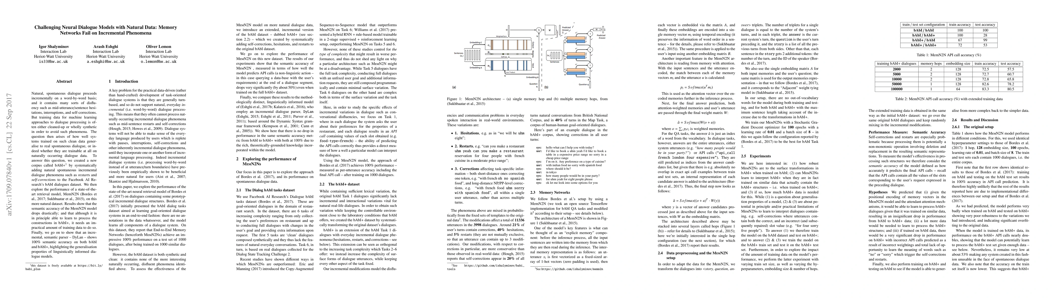 This paper investigates the performance of neural dialogue models, specifically MemN2N, on natural, incremental dialogue data that includes disfluencies and interruptions. Results show a significant drop in semantic accuracy for MemN2N on the new bAbI+ dataset, indicating poor generalisation to real dialogue, while an incremental, linguistically-informed parser, DyLan, maintains accuracy.