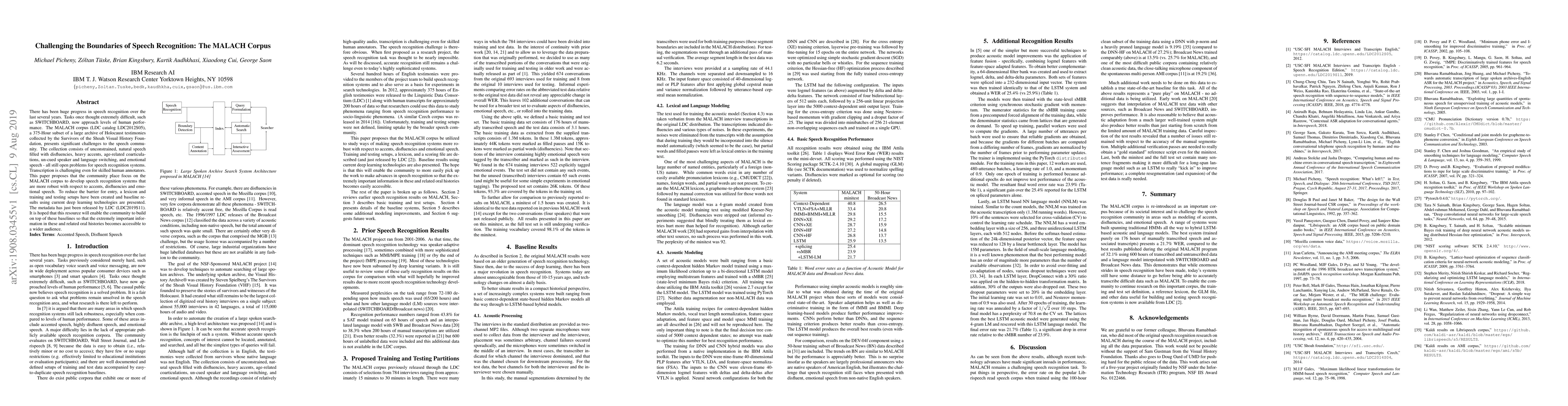 There has been huge progress in speech recognition over the last several years. Tasks once thought extremely difficult, such as SWITCHBOARD, now approach levels of human performance. The MALACH corpus (LDC catalog LDC2012S05), a 375-Hour subset of a large archive of Holocaust testimonies collected by the Survivors of the Shoah Visual History Foundation, presents significant challenges to the speech community. The collection consists of unconstrained, natural speech filled with disfluencies, heavy accents, age-related coarticulations, un-cued speaker and language switching, and emotional speech - all still open problems for speech recognition systems. Transcription is challenging even for skilled human annotators. This paper proposes that the community place focus on the MALACH corpus to develop speech recognition systems that are more robust with respect to accents, disfluencies and emotional speech. To reduce the barrier for entry, a lexicon and training and testing setups have been created and baseline results using current deep learning technologies are presented. The metadata has just been released by LDC (LDC2019S11). It is hoped that this resource will enable the community to build on top of these baselines so that the extremely important information in these and related oral histories becomes accessible to a wider audience.