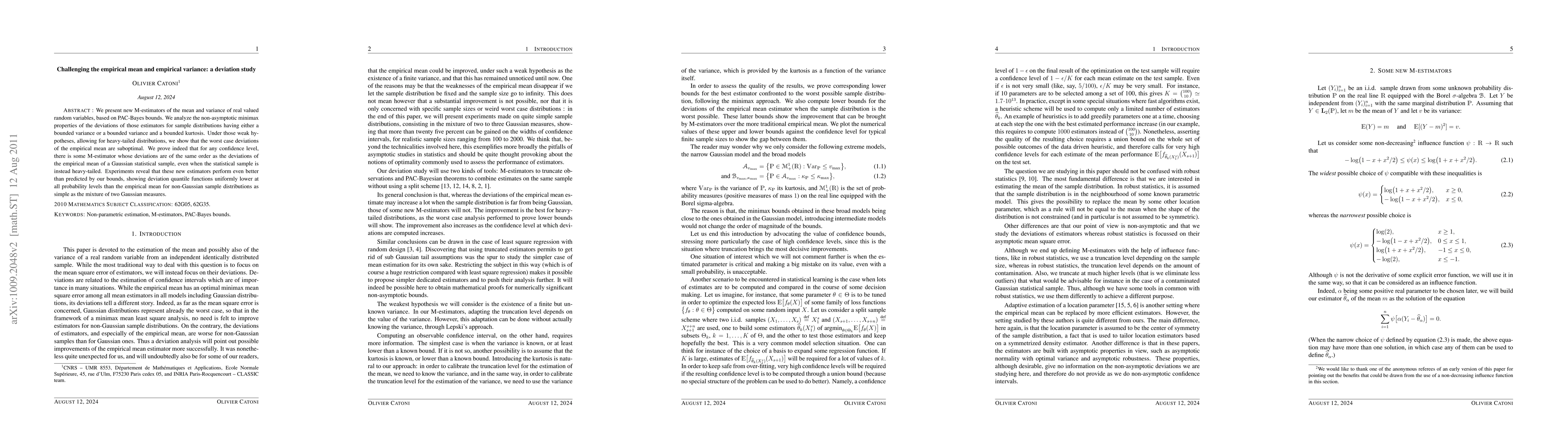 We present new M-estimators of the mean and variance of real valued random variables, based on PAC-Bayes bounds. We analyze the non-asymptotic minimax properties of the deviations of those estimators for sample distributions having either a bounded variance or a bounded variance and a bounded kurtosis. Under those weak hypotheses, allowing for heavy-tailed distributions, we show that the worst case deviations of the empirical mean are suboptimal. We prove indeed that for any confidence level, there is some M-estimator whose deviations are of the same order as the deviations of the empirical mean of a Gaussian statistical sample, even when the statistical sample is instead heavy-tailed. Experiments reveal that these new estimators perform even better than predicted by our bounds, showing deviation quantile functions uniformly lower at all probability levels than the empirical mean for non Gaussian sample distributions as simple as the mixture of two Gaussian measures.