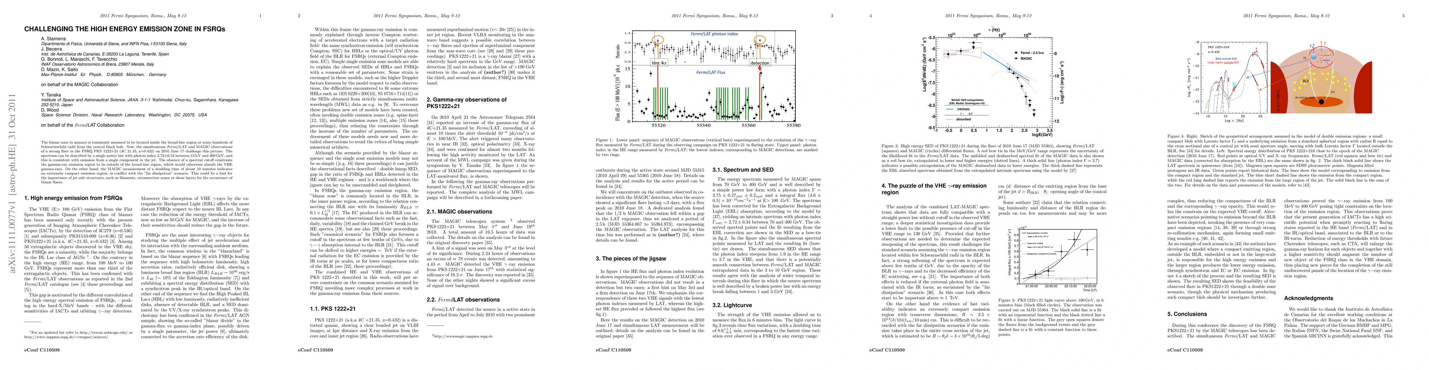 The research challenges the traditional location of the blazar zone in FSRQs (Flat Spectrum Radio Quasars), suggesting it might be outside the broad-line region based on simultaneous Fermi/LAT and MAGIC observations of a flare in PKS 1222+21. The findings indicate a single gamma-ray emission component with no spectral cutoff, implying the region is beyond absorption by the broad-line region. However, the extremely compact emission region, inferred from a rapid variability, conflicts with current models, hinting at the role of jet sub-structures like filaments or reconnection zones in blazar flares.