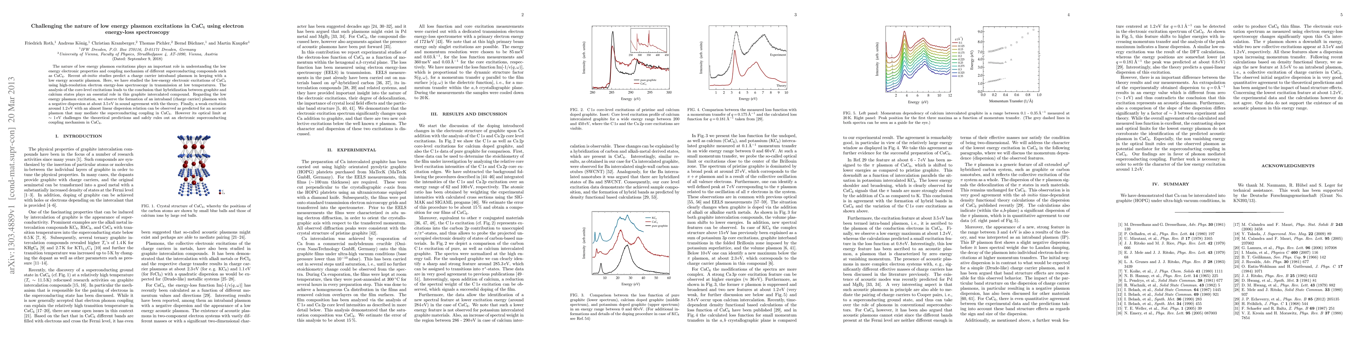 The nature of low energy plasmon excitations plays an important role in understanding the low energy electronic properties and coupling mechanism of different superconducting compounds such as CaC$_6$. Recent ab-initio studies predict a charge carrier intraband plasmon in keeping with a low energy acoustic plasmon. Here, we have studied the low-energy electronic excitations of CaC$_6$ using high-resolution electron energy-loss spectroscopy in transmission at low temperatures. The analysis of the core-level excitations leads to the conclusion that hybridization between graphite and calcium states plays an essential role in this graphite intercalated compound. Regarding the low energy plasmon excitation, we observe the formation of an intraband (charge carrier) plasmon with a negative dispersion at about 3.5 eV in sound agreement with the theory. Finally, a weak excitation around 1.2 eV with an almost linear dispersion relation can be observed as predicted for an acoustic plasmon that may mediate the superconducting coupling in CaC$_6$. However its optical limit at ~1 eV challenges the theoretical predictions and safely rules out an electronic superconducting coupling mechanism in CaC$_6$.
