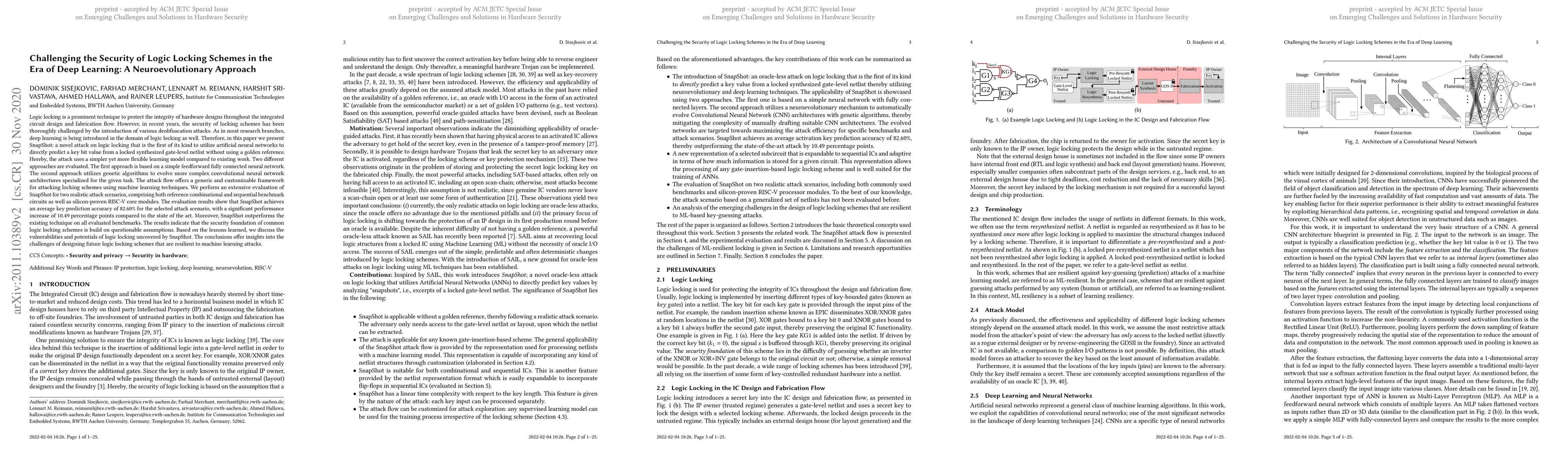 This paper presents SnapShot, a novel deep learning-based attack on logic locking that uses neural networks to predict key bit values directly from gate-level netlists without a golden reference. The attack employs both feedforward neural networks and evolved convolutional neural networks, achieving an average key prediction accuracy of 82.60%, outperforming existing methods and highlighting the vulnerabilities of current logic locking schemes.