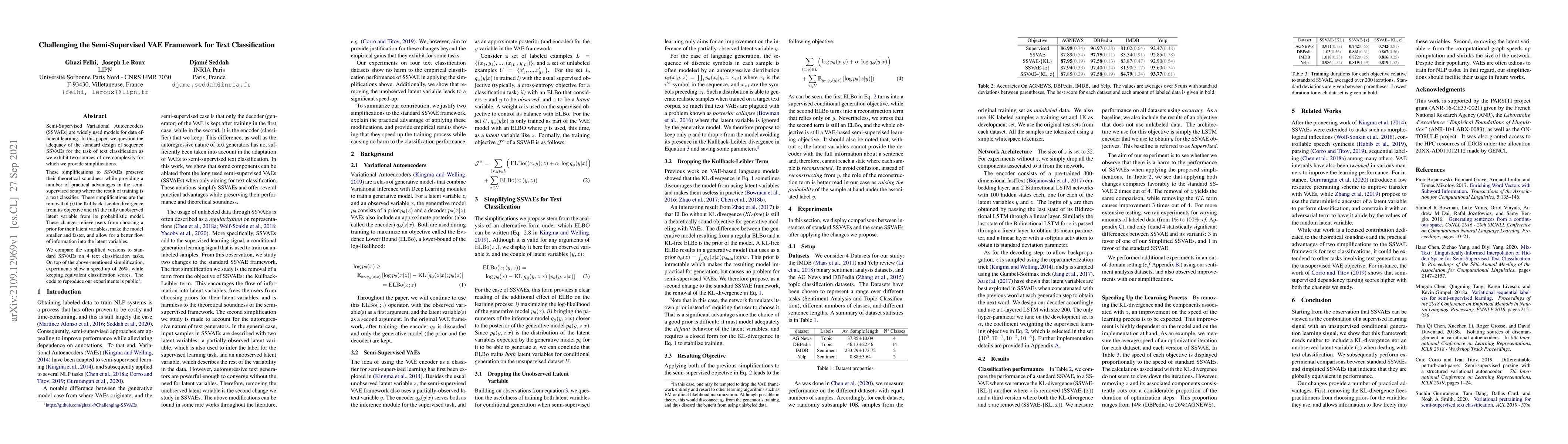 This paper proposes simplifications to the Semi-Supervised Variational Autoencoder (SSVAE) framework for text classification, removing the Kullback-Leibler divergence and the fully unobserved latent variable. These changes improve model efficiency and information flow without sacrificing classification performance.