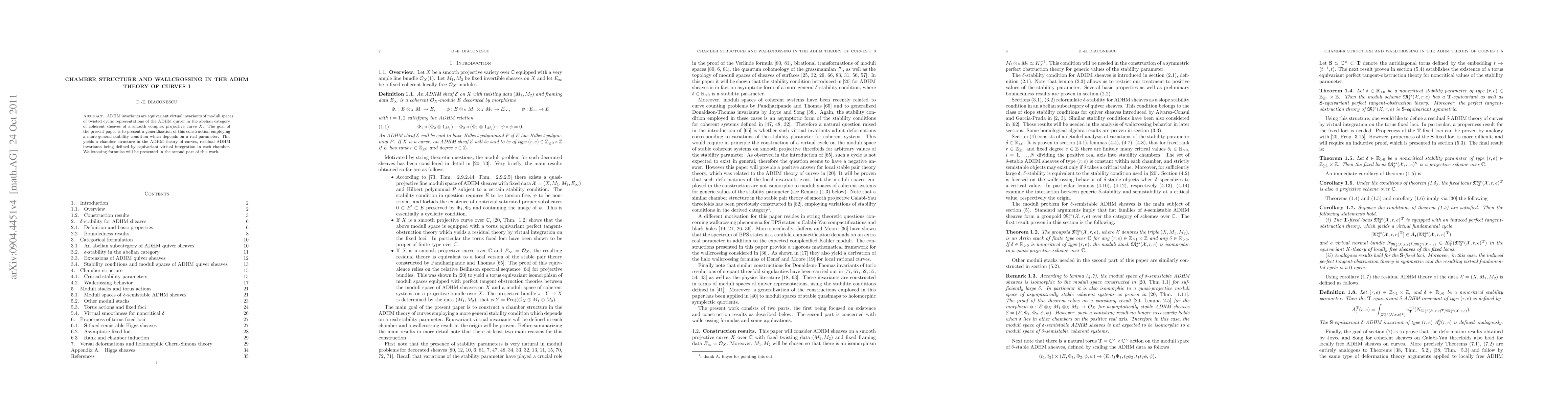 ADHM invariants are equivariant virtual invariants of moduli spaces of twisted cyclic representations of the ADHM quiver in the abelian category of coherent sheaves of a smooth complex projective curve X. The goal of the present paper is to present a generalization of this construction employing a more general stability condition which depends on a real parameter. This yields a chamber structure in the ADHM theory of curves, residual ADHM invariants being defined by equivariant virtual integration in each chamber. Wallcrossing results and applications to local stable pair invariants will be presented in the second part of this work.