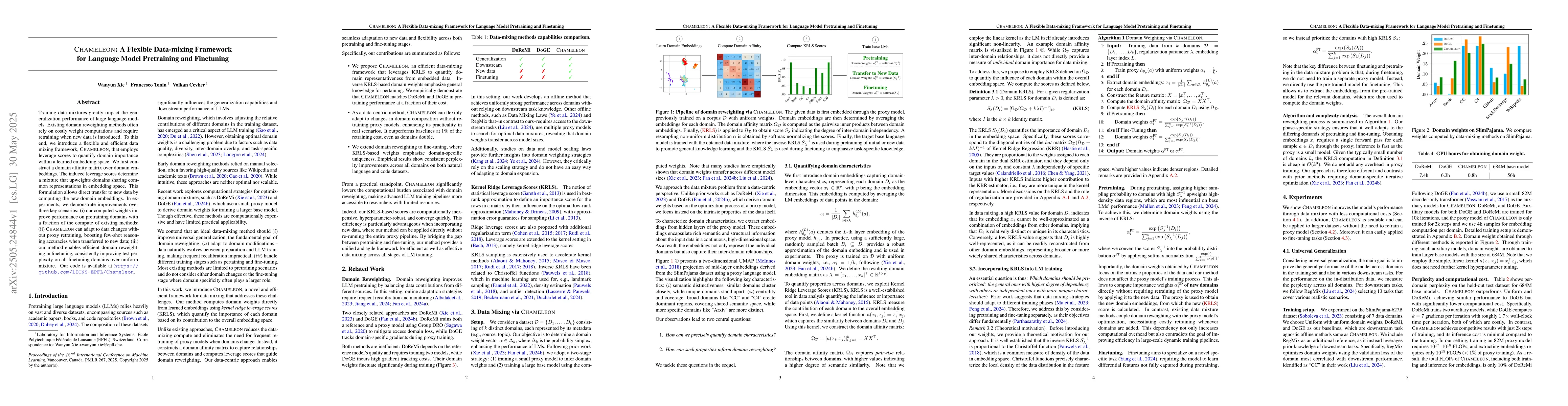 Chameleon introduces a flexible data-mixing framework for language model pretraining and finetuning, utilizing leverage scores to quantify domain importance within a learned embedding space. It constructs a domain affinity matrix and uses leverage scores to determine a domain mixture, upweighting domains with common representations in the embedding space.