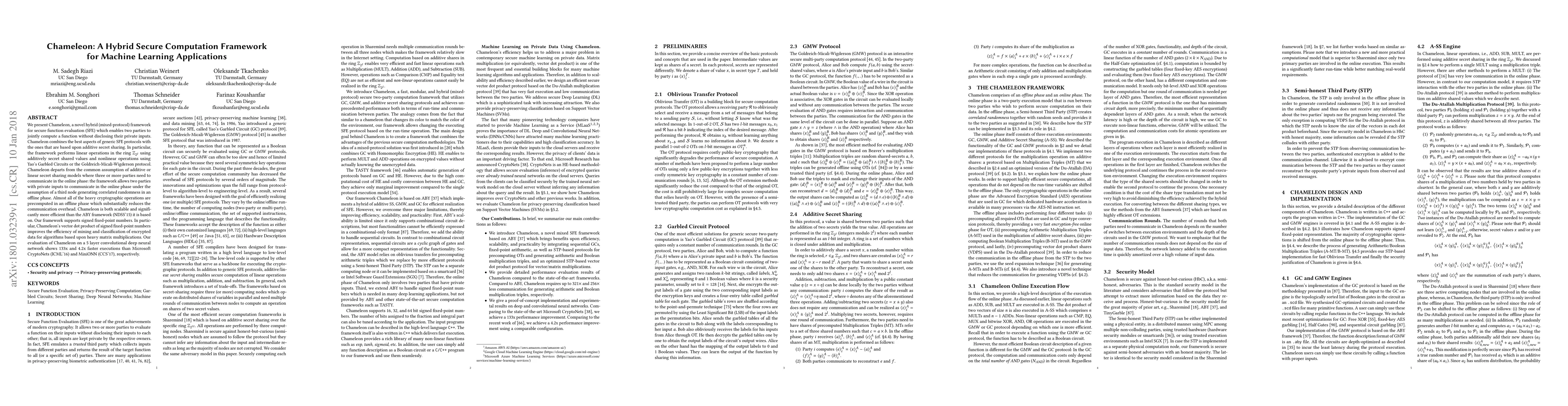 We present Chameleon, a novel hybrid (mixed-protocol) framework for secure function evaluation (SFE) which enables two parties to jointly compute a function without disclosing their private inputs. Chameleon combines the best aspects of generic SFE protocols with the ones that are based upon additive secret sharing. In particular, the framework performs linear operations in the ring $\mathbb{Z}_{2^l}$ using additively secret shared values and nonlinear operations using Yao's Garbled Circuits or the Goldreich-Micali-Wigderson protocol. Chameleon departs from the common assumption of additive or linear secret sharing models where three or more parties need to communicate in the online phase: the framework allows two parties with private inputs to communicate in the online phase under the assumption of a third node generating correlated randomness in an offline phase. Almost all of the heavy cryptographic operations are precomputed in an offline phase which substantially reduces the communication overhead. Chameleon is both scalable and significantly more efficient than the ABY framework (NDSS'15) it is based on. Our framework supports signed fixed-point numbers. In particular, Chameleon's vector dot product of signed fixed-point numbers improves the efficiency of mining and classification of encrypted data for algorithms based upon heavy matrix multiplications. Our evaluation of Chameleon on a 5 layer convolutional deep neural network shows 133x and 4.2x faster executions than Microsoft CryptoNets (ICML'16) and MiniONN (CCS'17), respectively.
