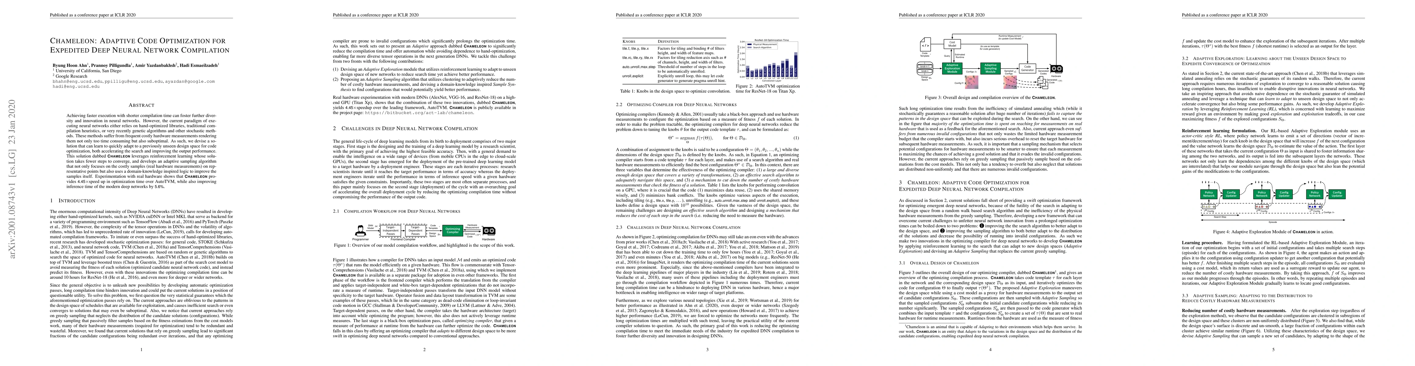 Achieving faster execution with shorter compilation time can foster further diversity and innovation in neural networks. However, the current paradigm of executing neural networks either relies on hand-optimized libraries, traditional compilation heuristics, or very recently genetic algorithms and other stochastic methods. These methods suffer from frequent costly hardware measurements rendering them not only too time consuming but also suboptimal. As such, we devise a solution that can learn to quickly adapt to a previously unseen design space for code optimization, both accelerating the search and improving the output performance. This solution dubbed Chameleon leverages reinforcement learning whose solution takes fewer steps to converge, and develops an adaptive sampling algorithm that not only focuses on the costly samples (real hardware measurements) on representative points but also uses a domain-knowledge inspired logic to improve the samples itself. Experimentation with real hardware shows that Chameleon provides 4.45x speed up in optimization time over AutoTVM, while also improving inference time of the modern deep networks by 5.6%.