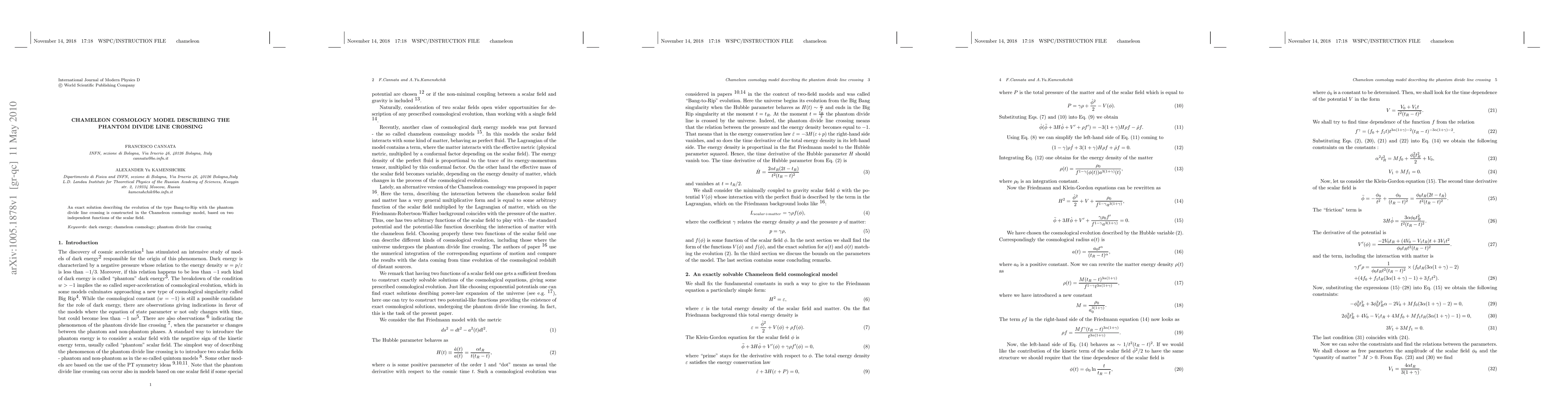 This paper presents an exact solution in the Chameleon cosmology model that details the evolution of a Bang-to-Rip scenario, crossing the phantom divide line, utilizing two independent scalar field functions. The model explores the dynamics of phantom energy in cosmological contexts.