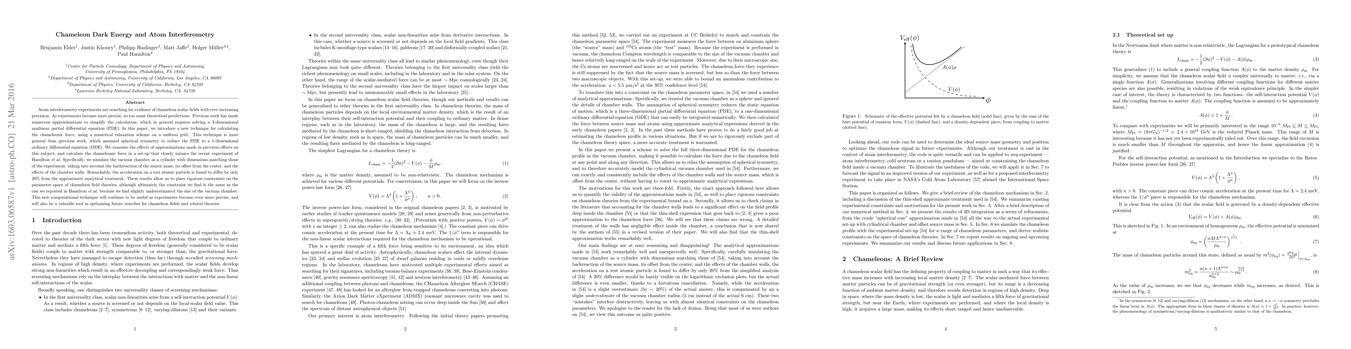 Atom interferometry experiments are searching for evidence of chameleon scalar fields with ever-increasing precision. As experiments become more precise, so too must theoretical predictions. Previous work has made numerous approximations to simplify the calculation, which in general requires solving a 3-dimensional nonlinear partial differential equation (PDE). In this paper, we introduce a new technique for calculating the chameleonic force, using a numerical relaxation scheme on a uniform grid. This technique is more general than previous work, which assumed spherical symmetry to reduce the PDE to a 1-dimensional ordinary differential equation (ODE). We examine the effects of approximations made in previous efforts on this subject, and calculate the chameleonic force in a set-up that closely mimics the recent experiment of Hamilton et al. Specifically, we simulate the vacuum chamber as a cylinder with dimensions matching those of the experiment, taking into account the backreaction of the source mass, its offset from the center, and the effects of the chamber walls. Remarkably, the acceleration on a test atomic particle is found to differ by only 20% from the approximate analytical treatment. These results allow us to place rigorous constraints on the parameter space of chameleon field theories, although ultimately the constraint we find is the same as the one we reported in Hamilton et al. because we had slightly underestimated the size of the vacuum chamber. This new computational technique will continue to be useful as experiments become even more precise, and will also be a valuable tool in optimizing future searches for chameleon fields and related theories.