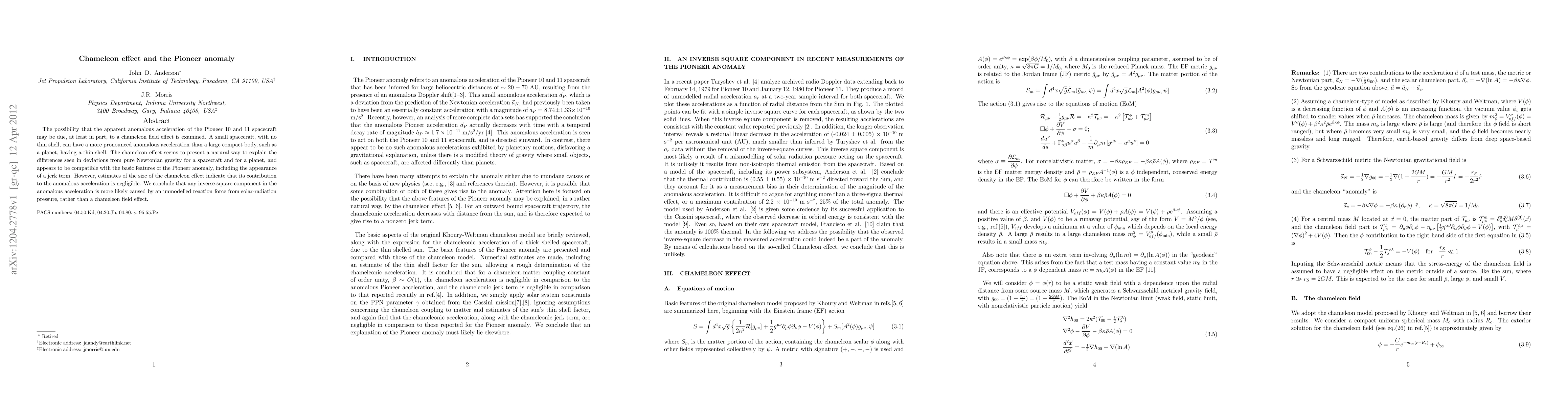 The possibility that the apparent anomalous acceleration of the Pioneer 10 and 11 spacecraft may be due, at least in part, to a chameleon field effect is examined. A small spacecraft, with no thin shell, can have a more pronounced anomalous acceleration than a large compact body, such as a planet, having a thin shell. The chameleon effect seems to present a natural way to explain the differences seen in deviations from pure Newtonian gravity for a spacecraft and for a planet, and appears to be compatible with the basic features of the Pioneer anomaly, including the appearance of a jerk term. However, estimates of the size of the chameleon effect indicate that its contribution to the anomalous acceleration is negligible. We conclude that any inverse-square component in the anomalous acceleration is more likely caused by an unmodelled reaction force from solar-radiation pressure, rather than a chameleon field effect.