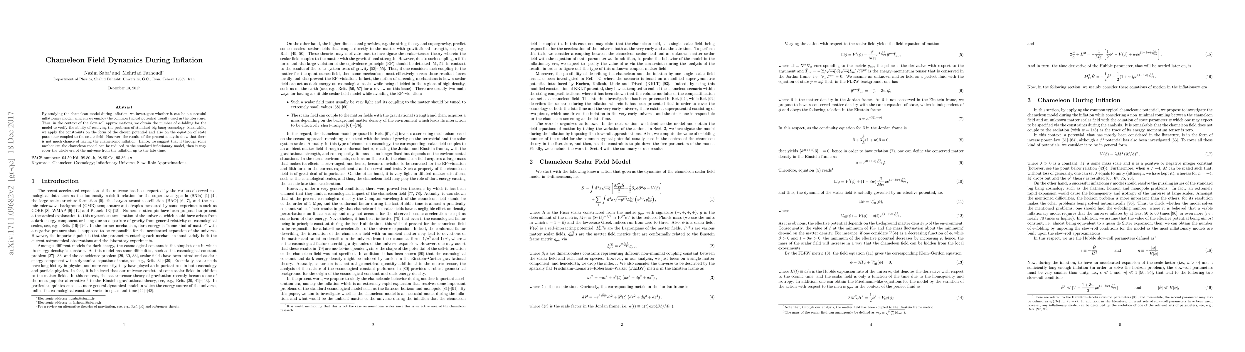 By studying the chameleon model during inflation, we investigate whether it can be a successful inflationary model, wherein we employ the common typical potential usually used in the literature. Thus, in the context of the slow-roll approximations, we obtain the number of e-folding for the model to verify the ability of resolving the problems of standard big bang cosmology. Meanwhile, we apply the constraints on the form of the chosen potential and also on the equation of state parameter coupled to the scalar field. However, the results of the present analysis show that there is not much chance of having the chameleonic inflation. Hence, we suggest that if through some mechanism the chameleon model can be reduced to the standard inflationary model, then it may cover the whole era of the universe from the inflation up to the late time.
