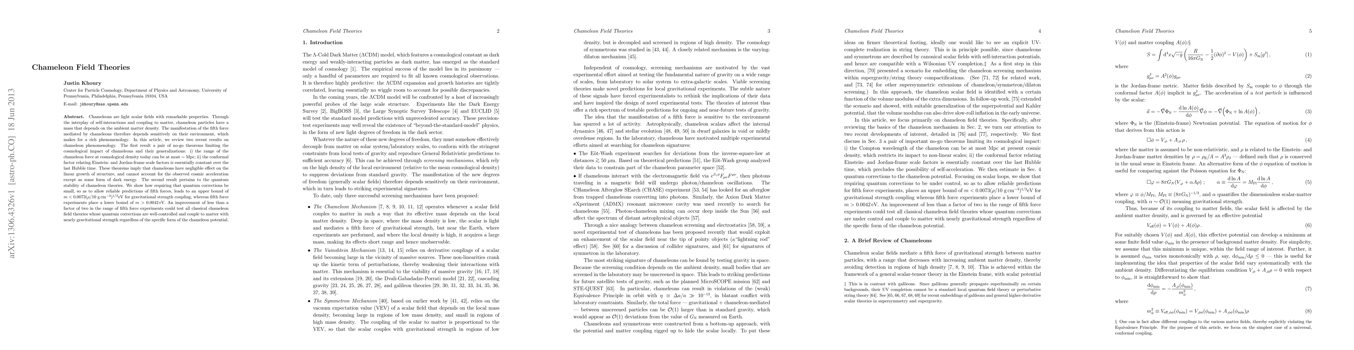 This paper reviews recent findings on chameleon field theories, demonstrating that no-go theorems limit their cosmological impact, constraining the range of their fifth force to ~Mpc and ruling out their role in cosmic acceleration. It also discusses quantum stability, showing that for reliable predictions, the mass of chameleons must be below a certain threshold, with current experiments nearly reaching this limit.